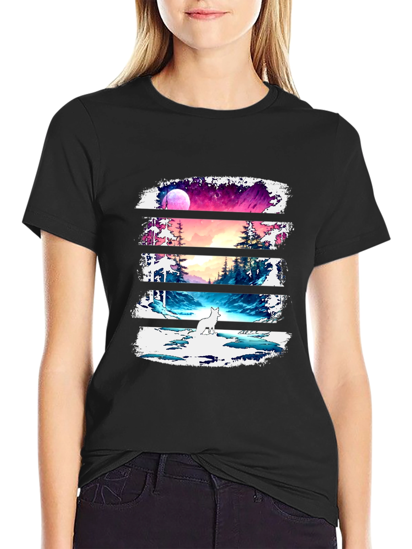 Showcase your love for the outdoors with this unique t-shirt. This stylish garment features a captivating layered design of a mountain landscape complete with trees, snow, and an animal silhouette. This artistic scene is perfect for nature enthusiasts and adventure seekers alike. Made from a comfortable, breathable fabric, this tee is ideal for everyday wear or outdoor activities. Its eye-catching print is sure to turn heads and spark conversations wherever you go. Step into the wild with this distinctive mountain vista t-shirt!