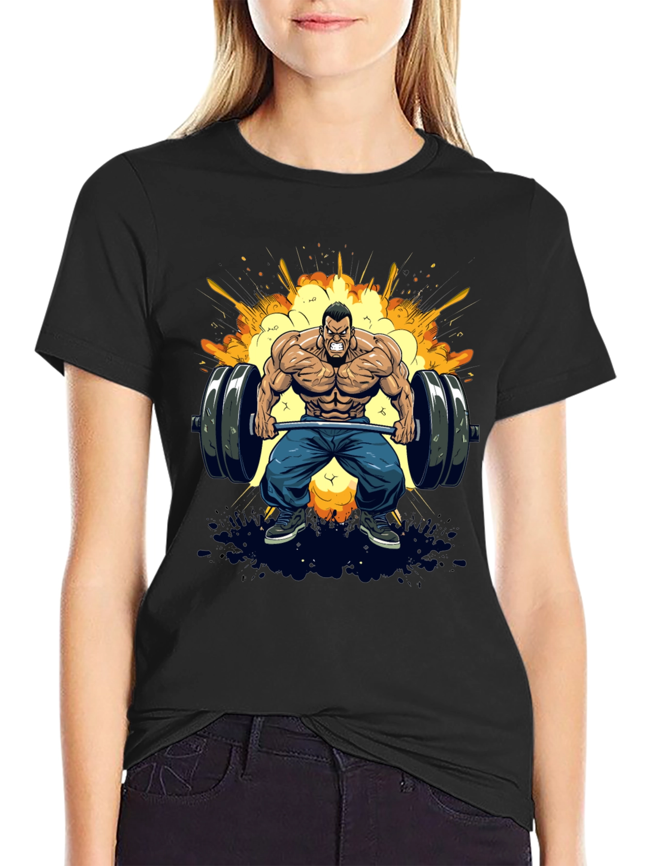 Unleash your inner beast with this eye-catching black t-shirt featuring a powerful graphic print! A muscular cartoon man straining while lifting a barbell takes center stage, complete with an explosive background. This bold design is perfect for gym-goers, weightlifters, and anyone who wants to make a statement. Made from comfortable, breathable fabric, this tee is ideal for workouts or casual wear. Show off your strength and determination with this unique and inspiring piece!
