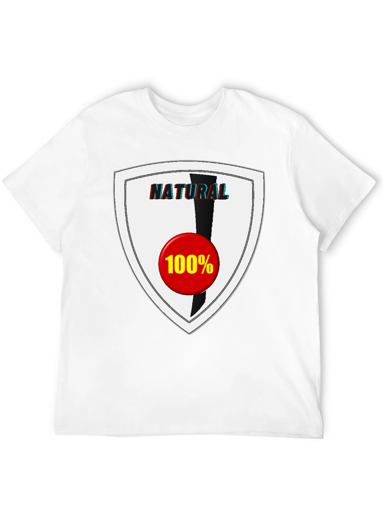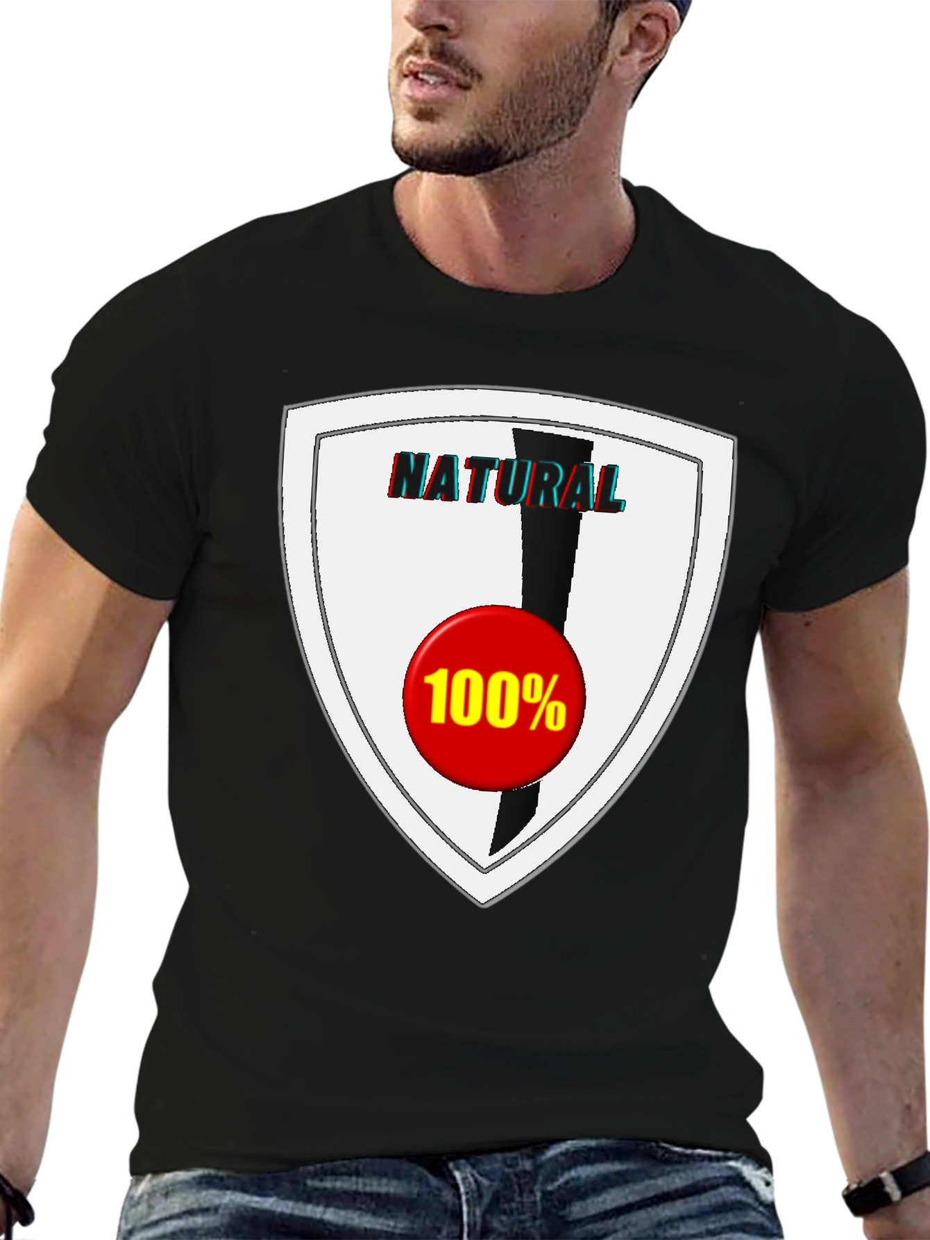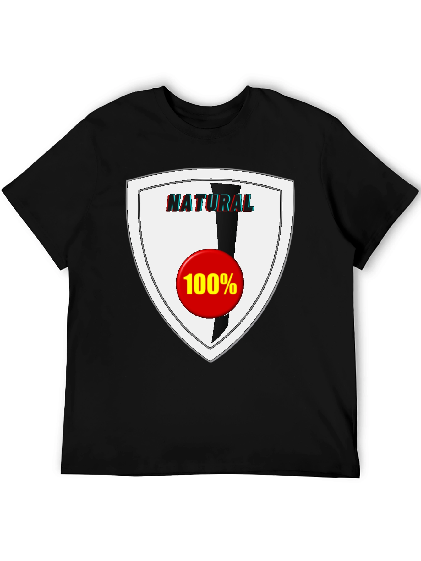 Showcase your commitment to all things natural with this bold graphic tee. The black cotton t-shirt features a striking shield design with the word "NATURAL" emblazoned across the top. A black vertical stripe descends into a vibrant red circle marked with "100%", indicating purity and quality. Made from comfortable materials, this tee is perfect for casual wear, making a statement while ensuring all-day comfort. Ideal for everyday style, parties, outdoor adventures, or expressing your personal values. Stand out from the crowd with this unique and eye-catching t-shirt.