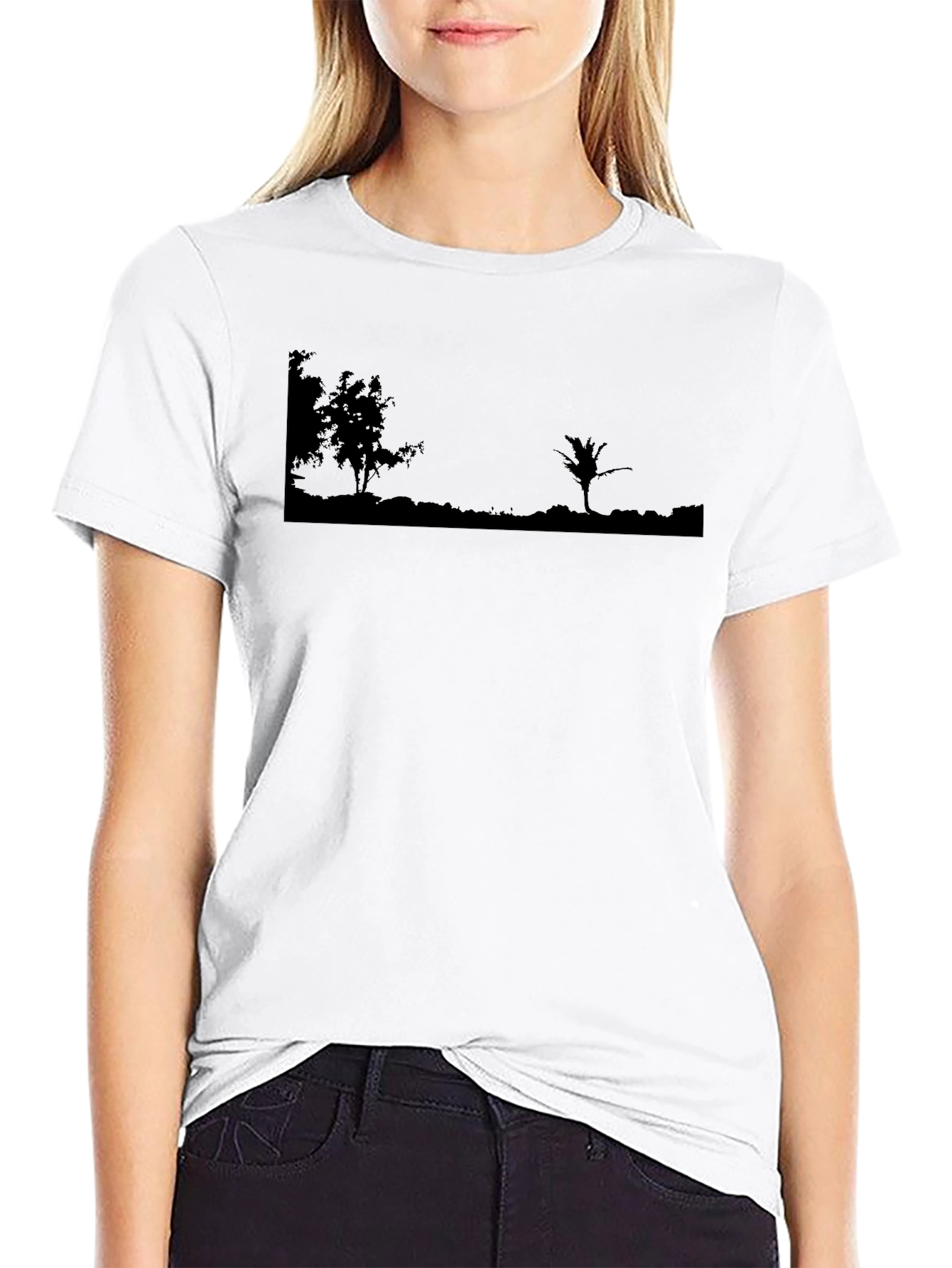 Elevate your casual wardrobe with this stylish black t-shirt featuring a unique nature scene graphic. The design showcases a silhouette of trees and landscape elements, creating a striking visual contrast against the dark fabric. Made from comfortable, breathable material, this tee is perfect for everyday wear. Its versatile design makes it easy to pair with jeans, shorts, or joggers for a relaxed, on-trend look. Whether you're heading to a casual outing or simply relaxing at home, this nature-inspired graphic tee is a great way to showcase your unique style and love for the outdoors. Add this standout piece to your collection and make a statement wherever you go.