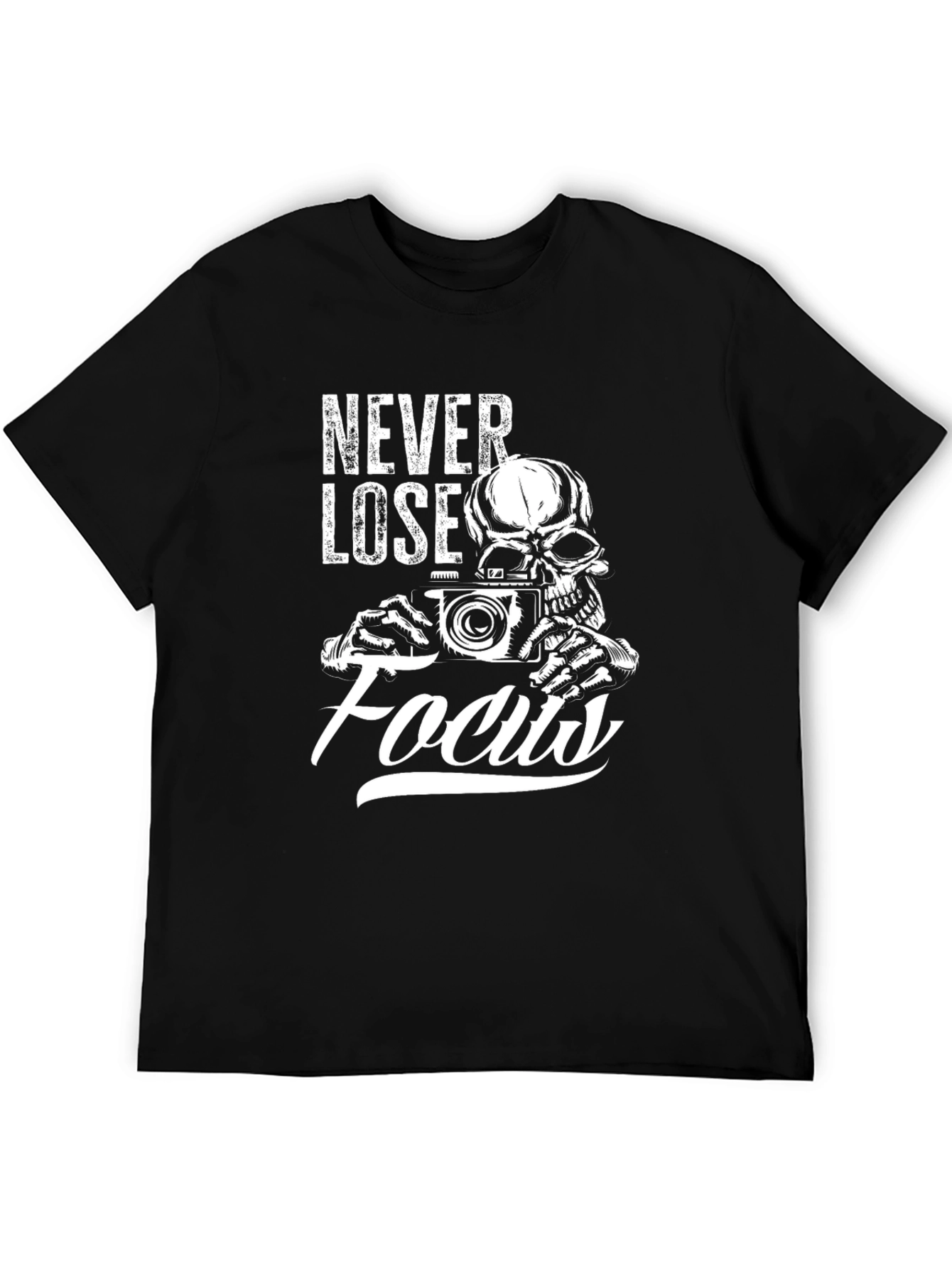 Capture attention with this edgy "Never Lose Focus" graphic t-shirt. The black tee features a bold white print of a skull holding a vintage camera, perfectly blending morbid aesthetics with a passion for photography. The soft fabric ensures comfort while making a statement. Ideal for photographers, artists, or anyone with a unique sense of style. Wear it casually, at a photo shoot, or out with friends to express your creativity and dedication to your craft. A must-have addition to any wardrobe for those who dare to be different and always stay focused.