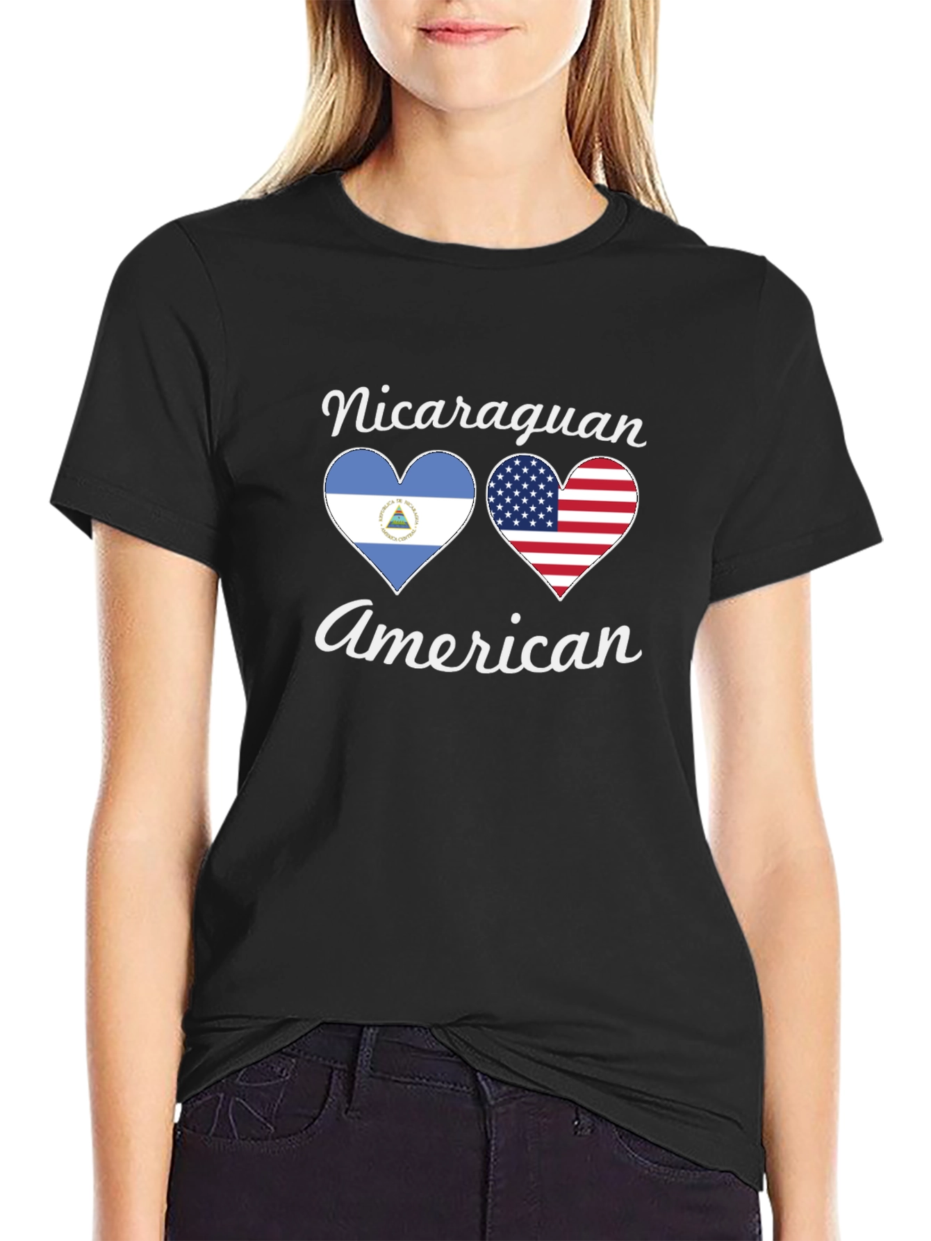 Show off your heritage with this unique Nicaraguan American T-shirt. This stylish black tee features two heart designs, one filled with the Nicaraguan flag and the other with the American flag, symbolizing the wearer's dual heritage. The words 'Nicaraguan' and 'American' are tastefully printed in a matching white cursive font above and below the hearts respectively. This comfortable tee is made from what appears to be high-quality cotton, making it perfect for everyday wear, cultural events, or as a thoughtful gift for someone proud of their Nicaraguan-American roots. Stand out and celebrate your identity with this meaningful design!