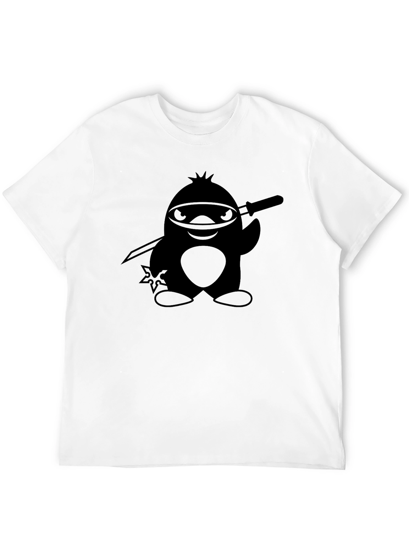 Embrace your inner ninja with this eye-catching black t-shirt! Featuring a unique graphic of a stealthy penguin warrior, complete with a ninja mask, sword, and throwing star, this shirt is sure to turn heads. Made from comfortable, breathable fabric, it's perfect for everyday wear or a fun night out. The striking black color provides a classic, versatile look that pairs well with jeans, shorts, or casual pants. Stand out from the crowd with this playful yet bold design that showcases your unique sense of style. Get yours today and unleash your penguin power!