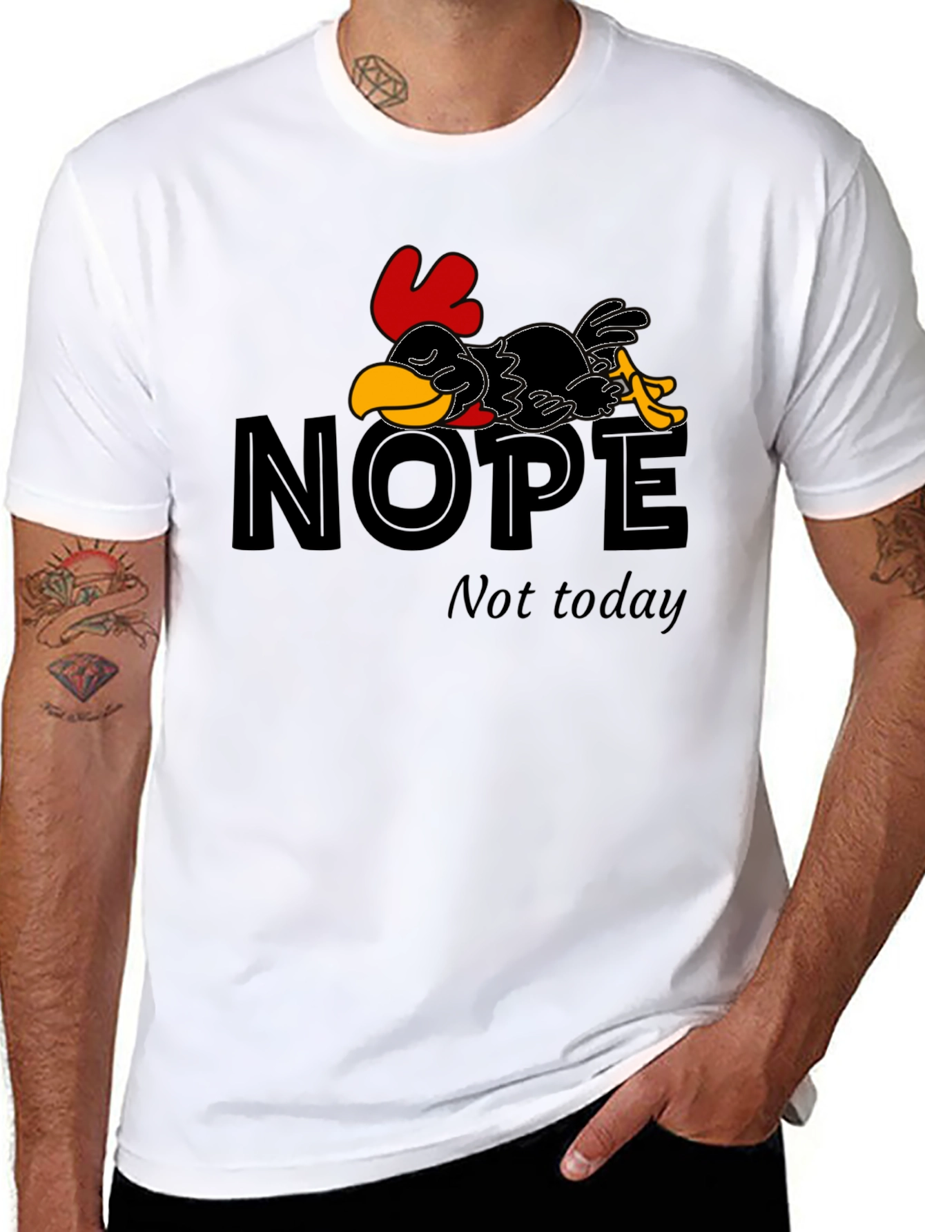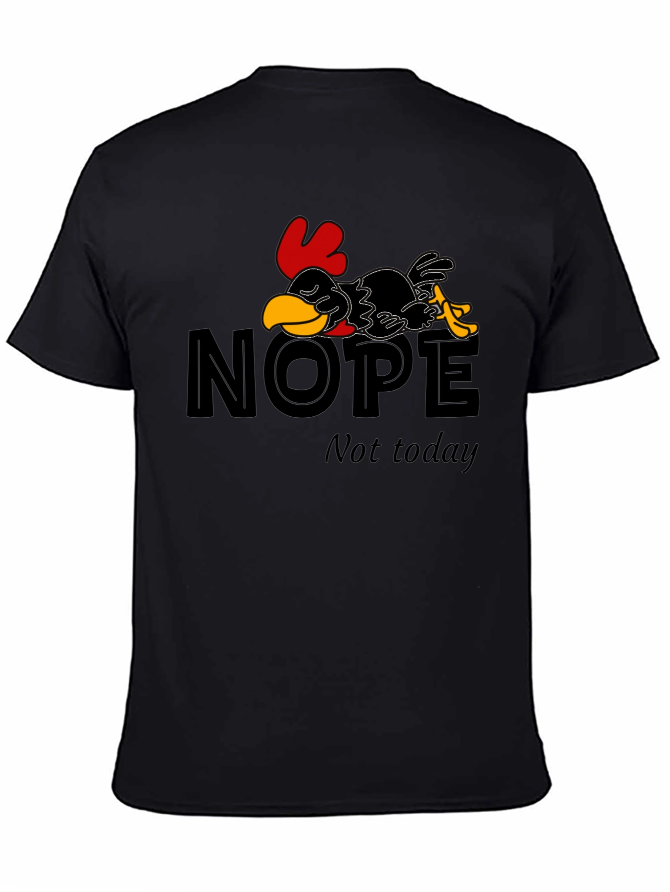 This black t-shirt features a fun and relatable design: a cartoon chicken lying down, seemingly taking a break from life, with the words "NOPE" above and "Not today" below. It's made from a soft-looking fabric that appears comfortable for everyday wear. The bold graphic stands out against the dark background, making it a statement piece that will surely bring a smile. Perfect for casual outings, lounging at home, or as a humorous gift for those who appreciate a lazy day. Show off your relaxed attitude with this unique tee!