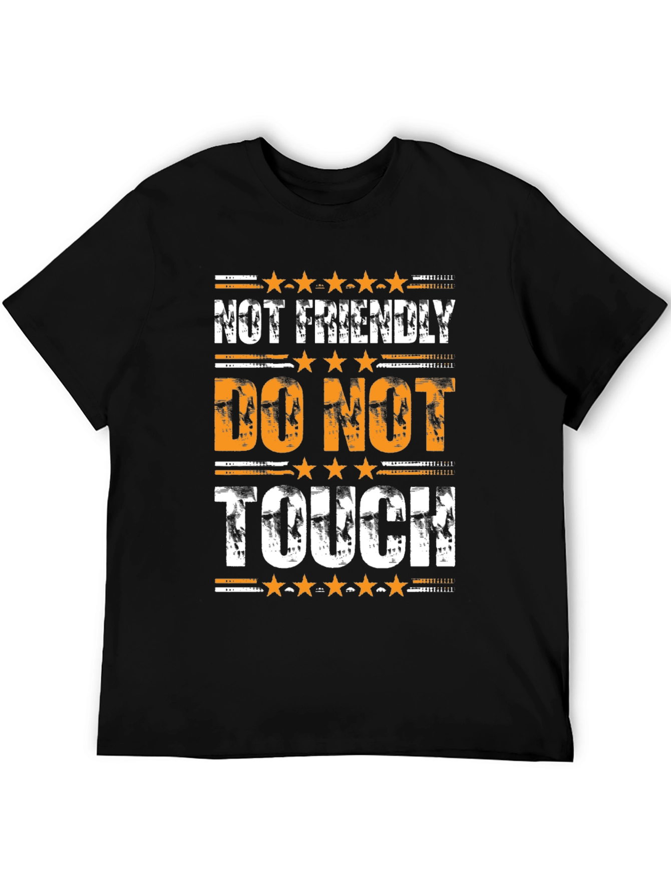 Make a statement with this bold black graphic tee. Featuring the phrase "Not Friendly, Do Not Touch" in distressed white and orange lettering, this t-shirt conveys a clear message with a touch of edgy style. Decorative star and line elements accentuate the design, adding to its unique appeal. Made from a soft-looking fabric, this tee offers both comfort and durability. Perfect for casual wear, concerts, or expressing your unique personality, this t-shirt will definitely make you stand out from the crowd. Ideal for those who like to keep to themselves with a touch of humor.