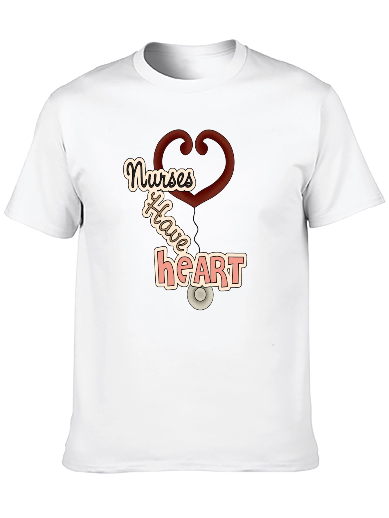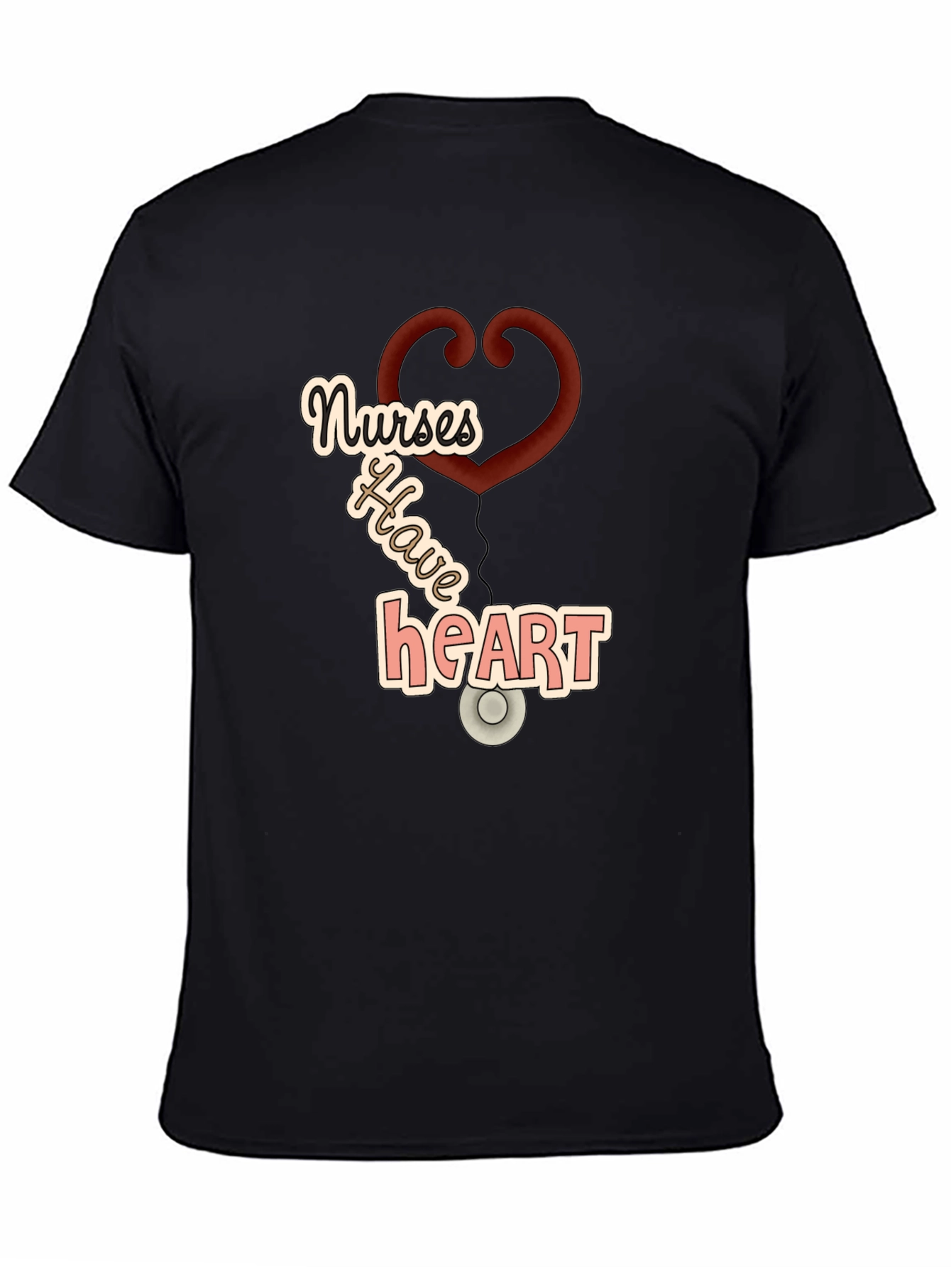 Show your appreciation for nurses with this stylish black t-shirt. The design features a unique graphic incorporating a stethoscope that is shaped like a heart. Accompanying the stethoscope are the words 'Nurses have heart' in a charming font. This classic-fit tee is perfect for everyday wear, nursing events, or as a thoughtful gift for the caring nurses in your life. Get yours today and wear your appreciation with pride!