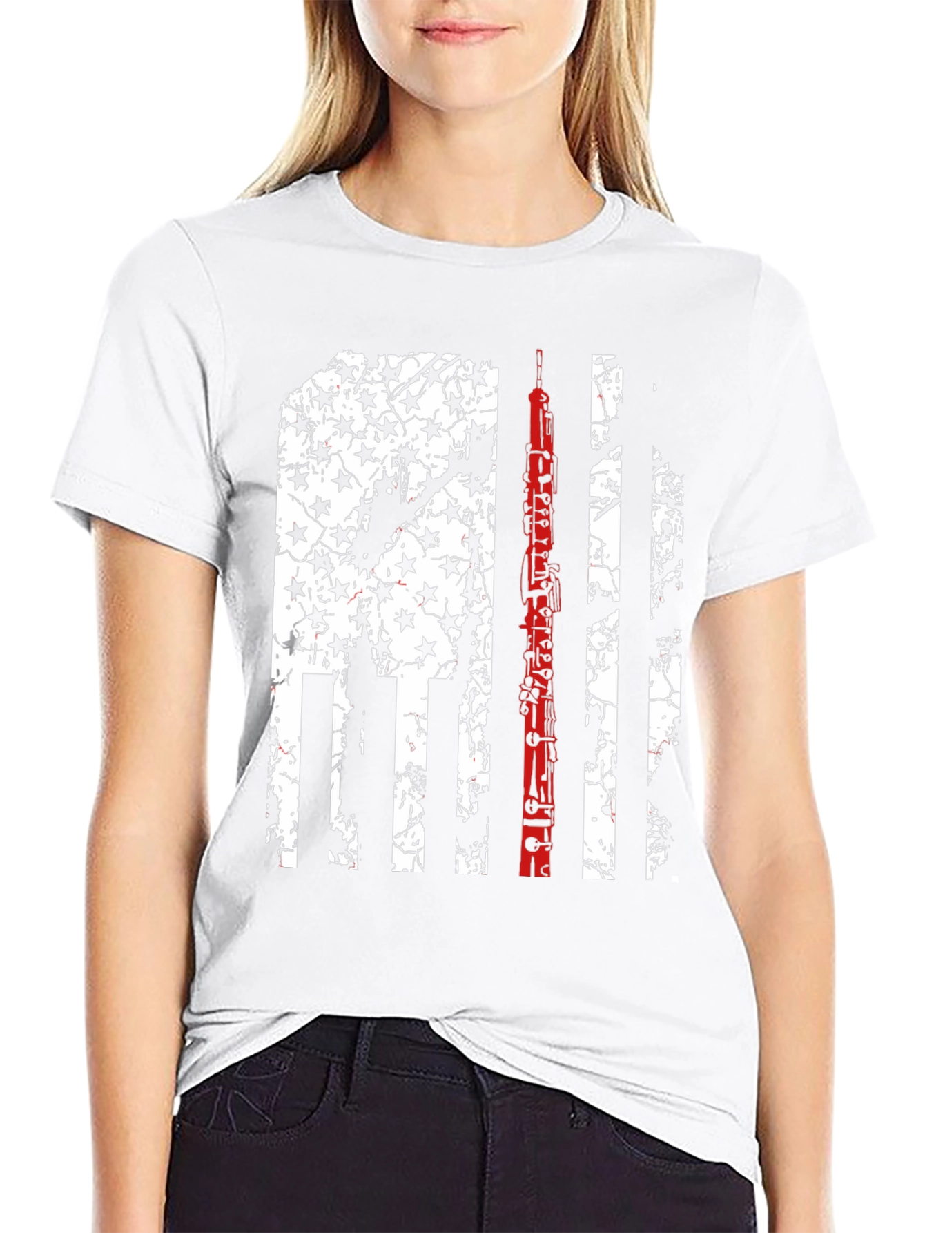 Show your love for music and country with this unique Oboe Flag Graphic Tee. This black t-shirt features a distressed American flag design with a vibrant red oboe silhouette incorporated within the stripes. The design is a bold statement piece for any musician or patriotic individual. The t-shirt appears to be made of a comfortable, breathable fabric, making it perfect for everyday wear. Ideal for music teachers, oboe players, or anyone who appreciates a blend of musical passion and American pride. Wear it to concerts, rehearsals, or casual outings to express your interests. A standout piece that combines style and patriotism.