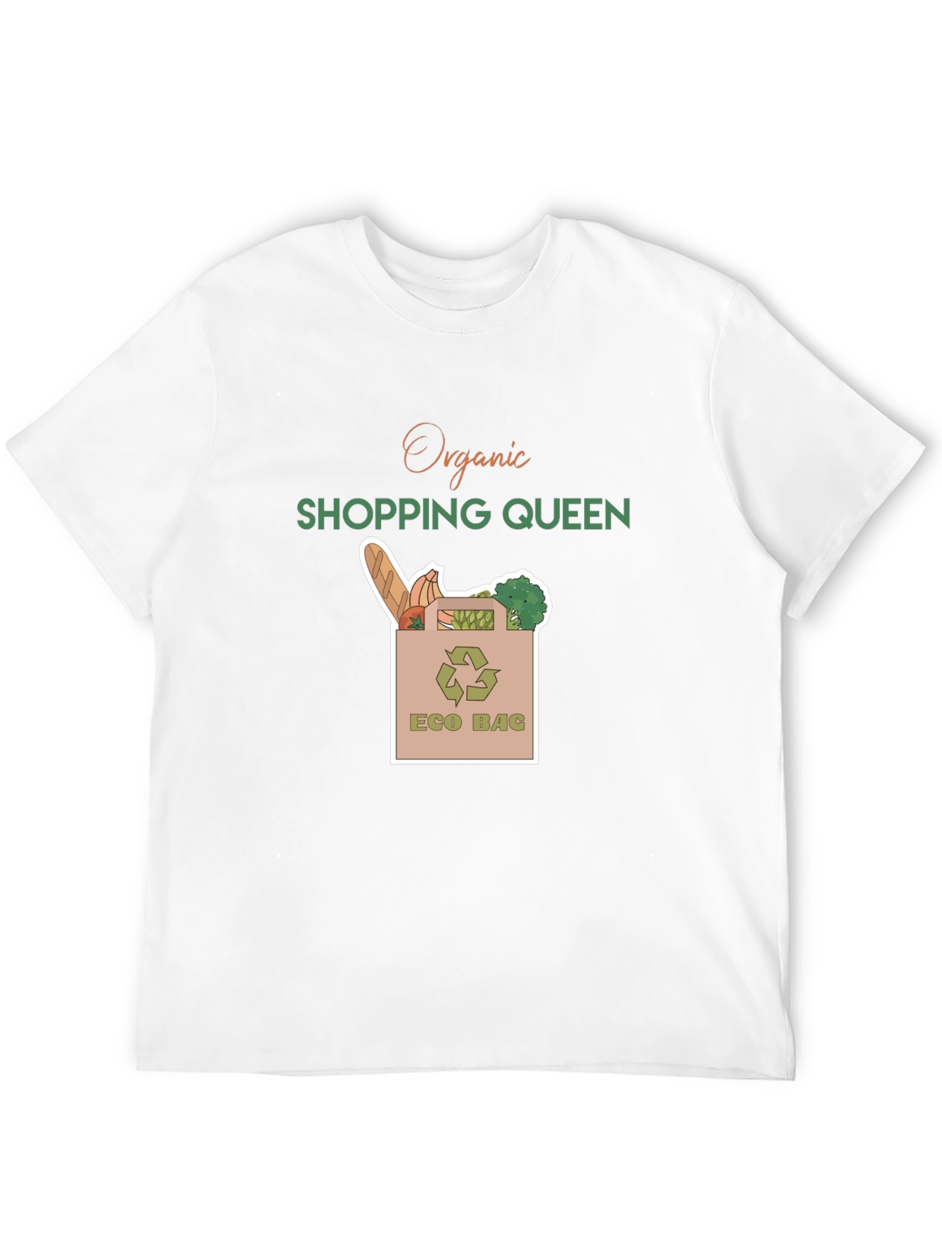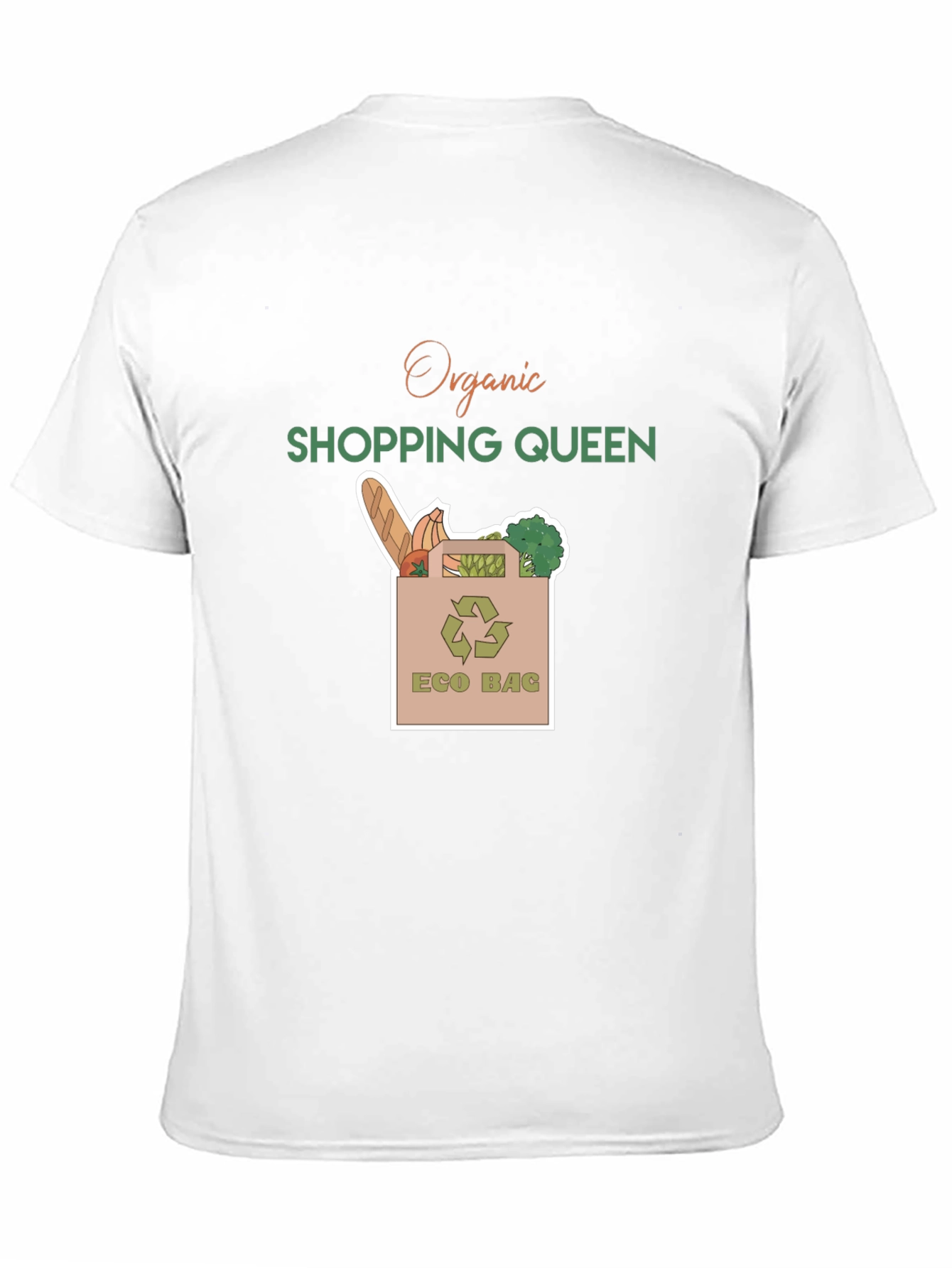 Show off your love for organic shopping with this stylish black t-shirt. This comfortable tee features the text "Organic Shopping Queen", in a unique design with a full eco bag image. The eco bag image has groceries sticking out of it with a recycling logo on the bag. Great for a trip to the farmer's market or everyday wear.