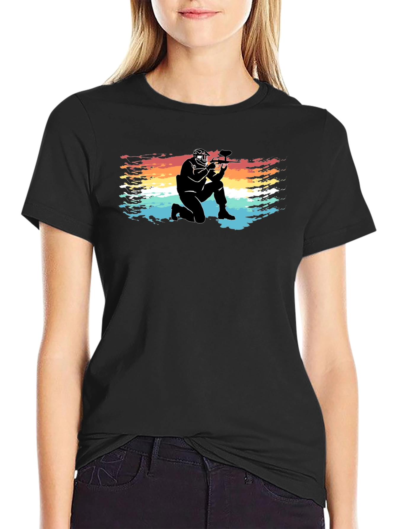 Show off your love for paintball with this unique graphic tee! This black t-shirt features a bold graphic of a paintball player in action. The vintage-inspired backdrop adds a cool, retro vibe. Made from a comfortable, breathable fabric, this tee is perfect for casual wear, paintball outings, or lounging around. Express your passion for paintball with this eye-catching and stylish tee. A great gift for paintball enthusiasts! Wear it to the field, the gym, or just around town to show your love for the sport. It is sure to be a conversation starter and a hit among your friends. Get yours today and let the game begin!