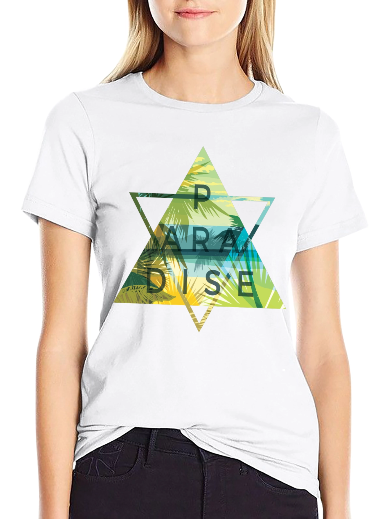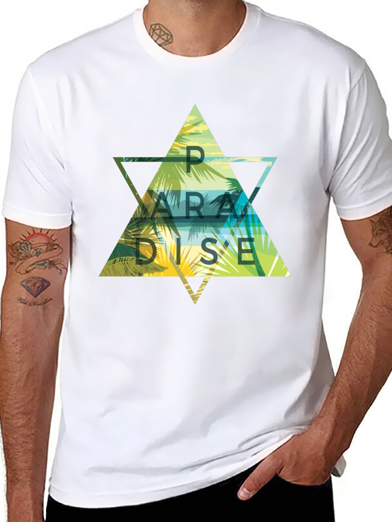 Embrace the island vibes with this eye-catching black t-shirt. The tee features a bold, geometric graphic design with the word "PARADISE" emblazoned across a vibrant tropical scene of palm trees and a serene shoreline. Crafted from a soft and breathable fabric, this shirt offers both comfort and style. Perfect for casual outings, beach days, or simply adding a touch of summer to your everyday wardrobe. Stand out with this unique and stylish tee that captures the essence of a tropical getaway.