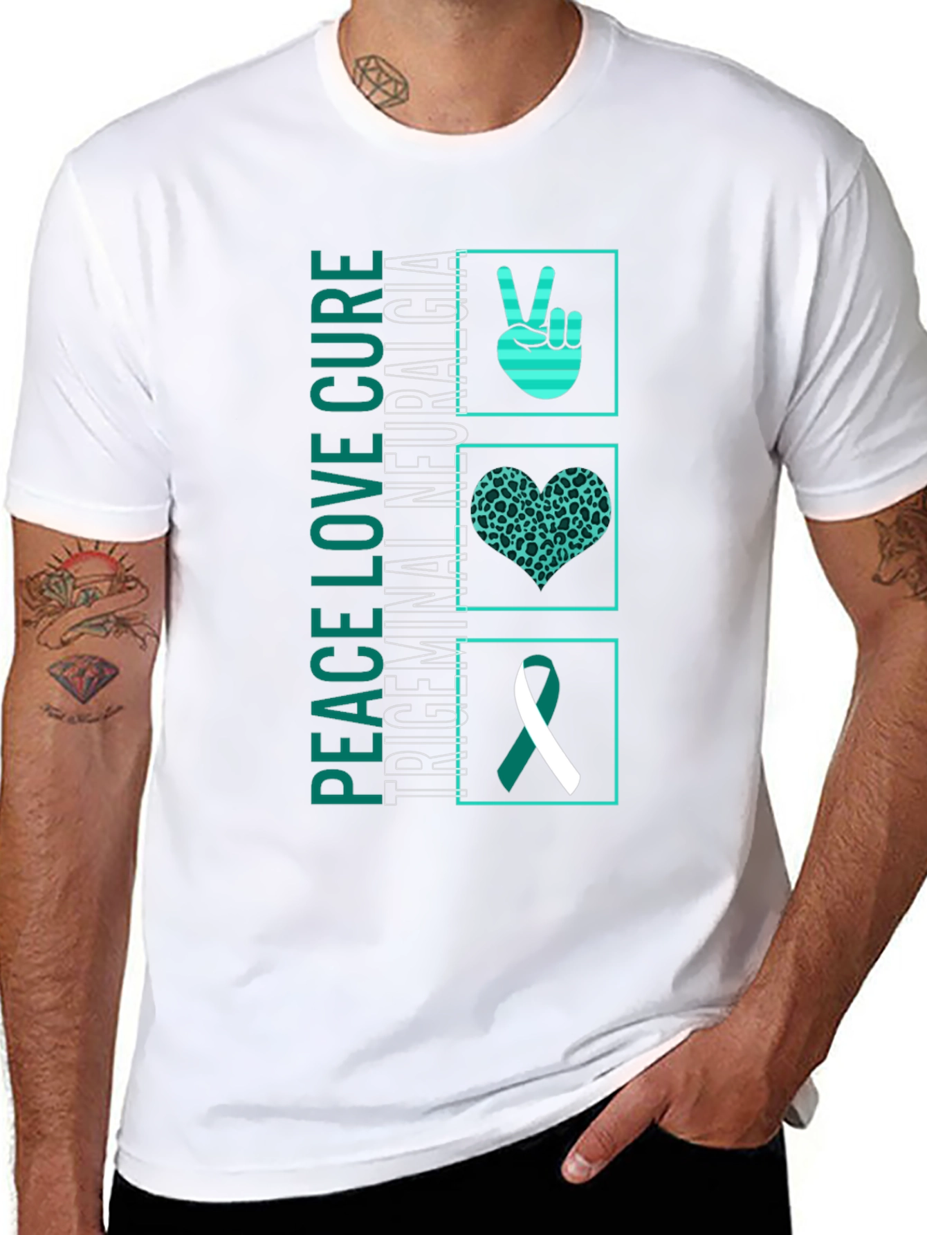 Show your support with this eye-catching black t-shirt featuring a unique design. The shirt displays the words "Peace Love Cure" alongside "Trigeminal Neuralgia", represented by a peace sign, a patterned heart, and an awareness ribbon enclosed in teal squares. Made from a comfortable-looking fabric, this t-shirt is perfect for raising awareness, showing solidarity, or simply expressing your personal style. Wear it to support the cause, participate in awareness events, or as a thoughtful gift for someone affected by Trigeminal Neuralgia. A meaningful and stylish addition to any wardrobe.