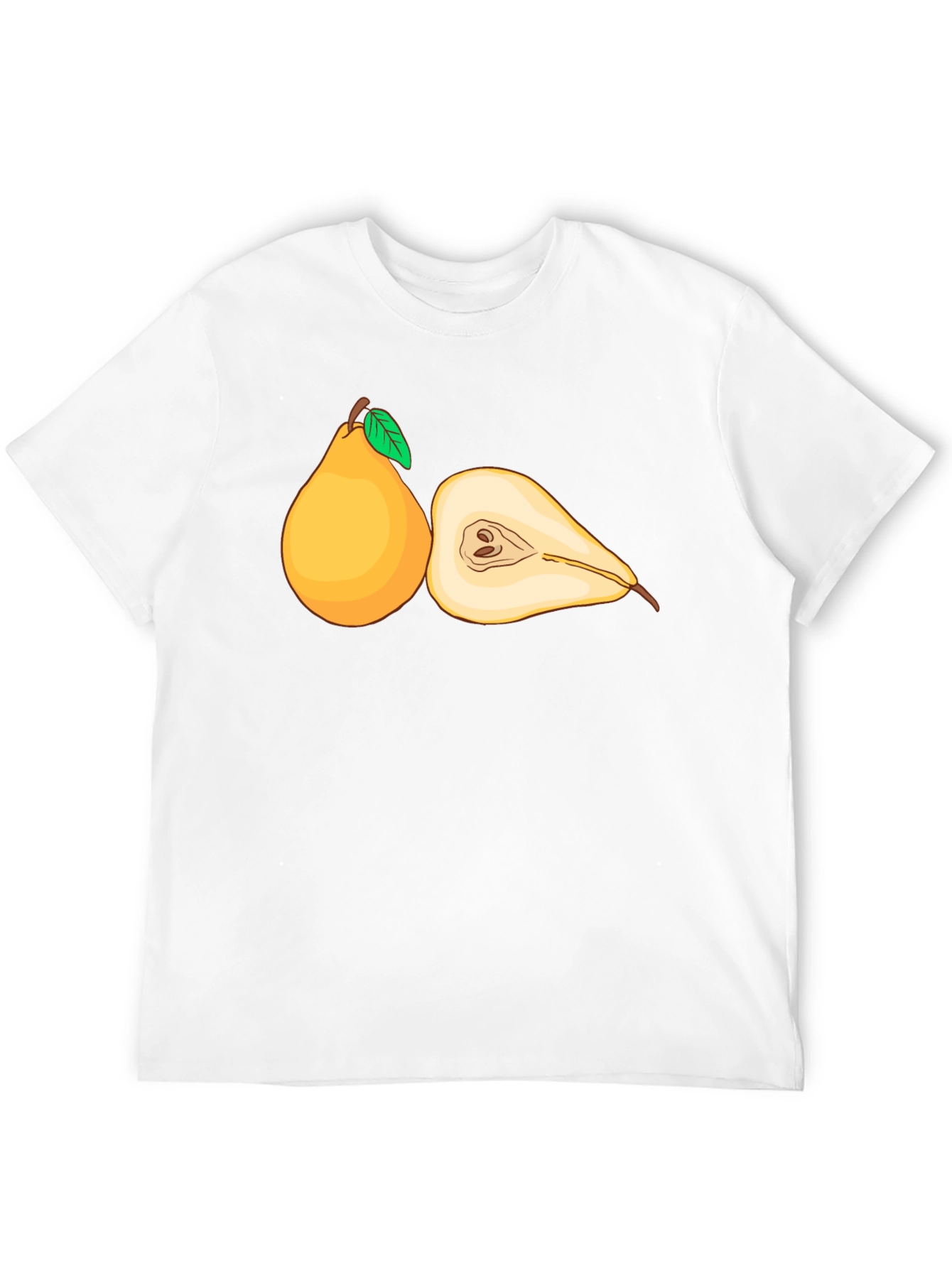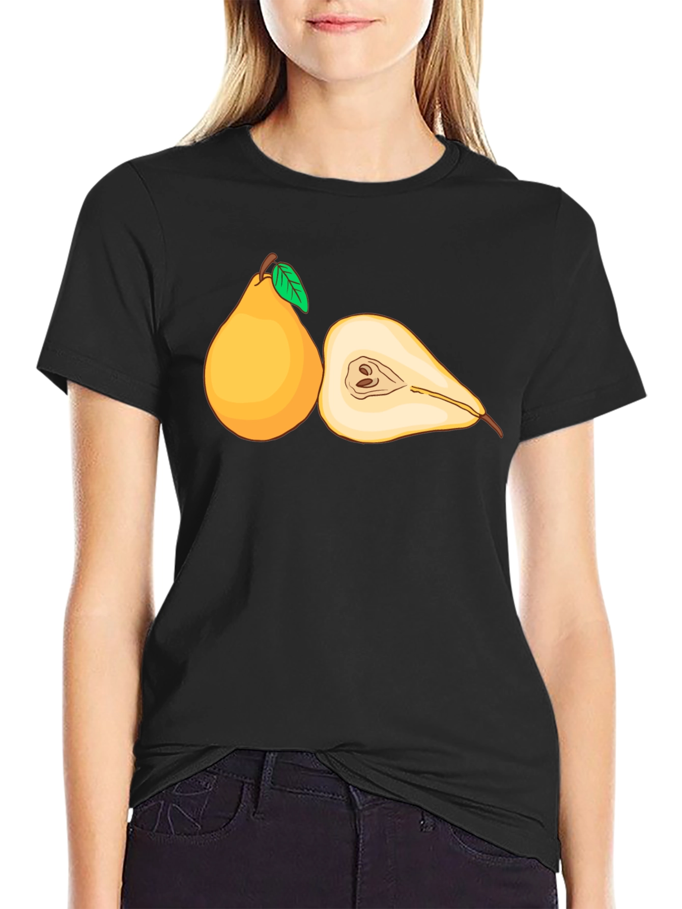 This stylish black t-shirt features a unique graphic design of a whole pear and a pear sliced in half. The design is eye-catching with detailed outlines and bright yellow coloring with green leaves. Made from a soft, breathable fabric, this shirt offers a comfortable fit for everyday wear. Perfect for fruit lovers or anyone who enjoys unique and playful designs. Ideal for casual outings, weekend adventures, or as a fun gift. This tee is sure to add a touch of whimsy to any outfit.