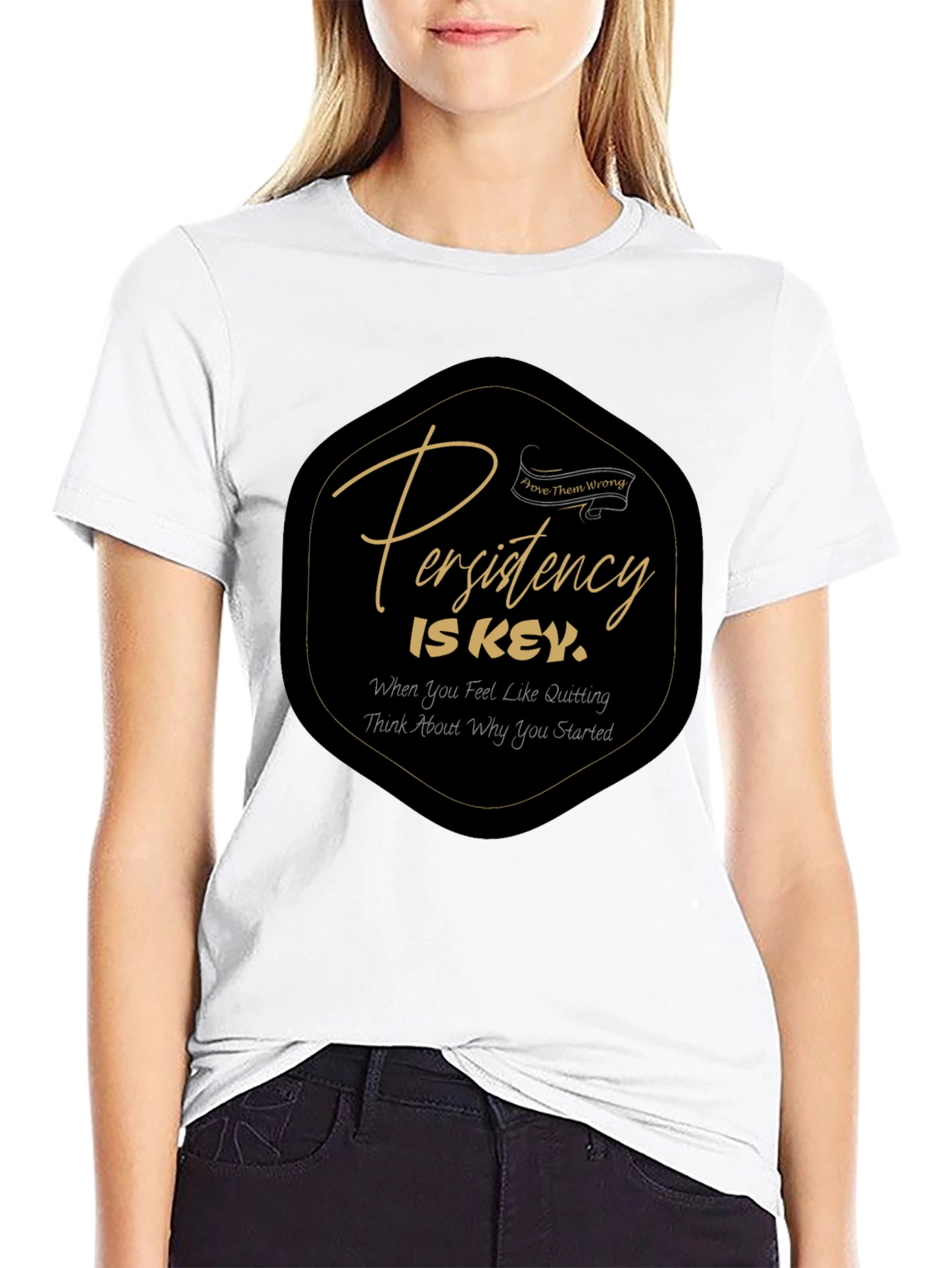 This stylish black t-shirt features a motivational message in a classic design. The graphic showcases the phrase "Persistence is Key" in an elegant script, encouraging the wearer to stay focused on their goals. The phrase "Prove Them Wrong" is also printed on the shirt. Below it the motivational quote "When you feel like quitting, think about why you started" can be found. Made from soft, breathable fabric, this shirt offers both comfort and style. The relaxed fit makes it suitable for everyday wear, while the bold graphic adds a touch of inspiration to any outfit. Ideal for those who appreciate motivational apparel and a minimalist aesthetic. Great for casual outings, gym sessions, or lounging at home.