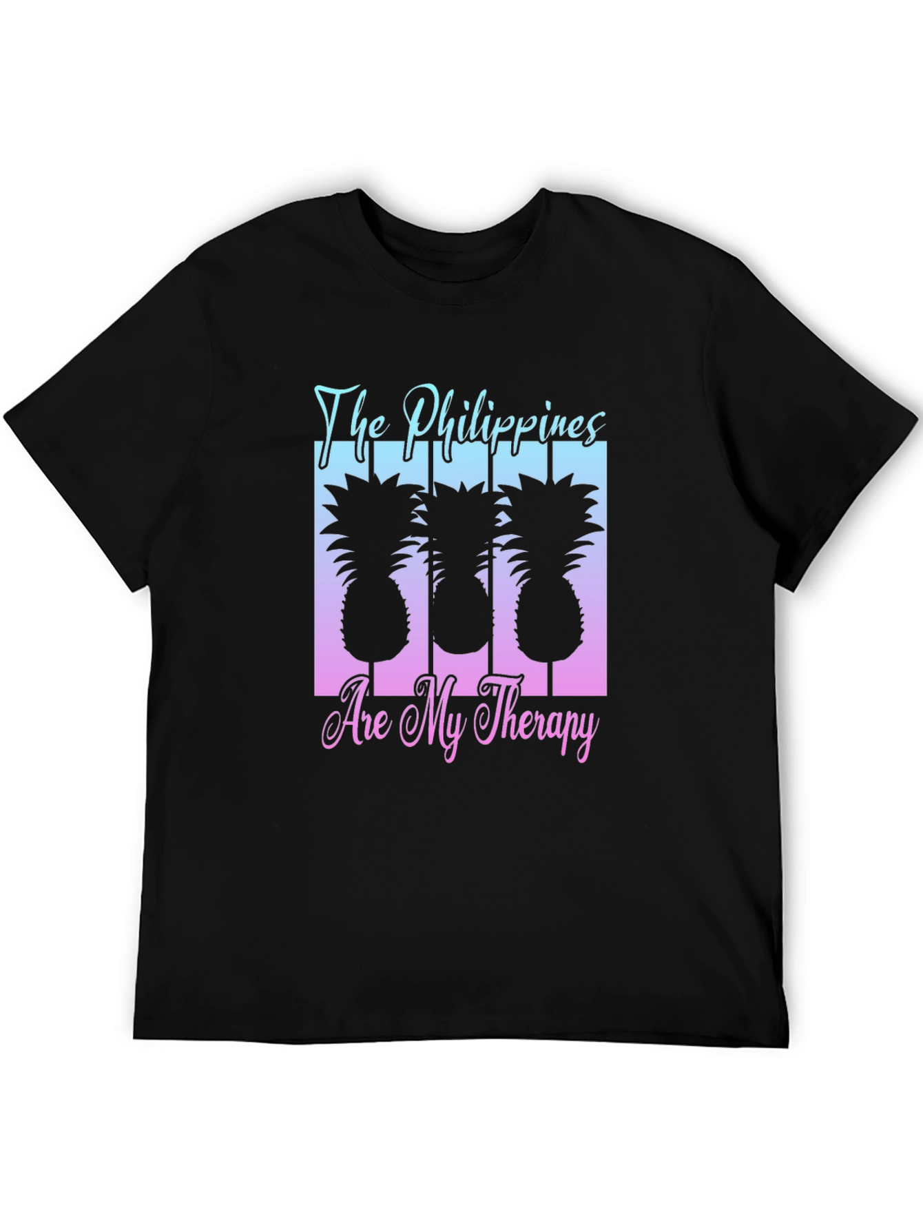 Show your love for the Philippines with this eye-catching black graphic tee. Featuring a vibrant design with three pineapple silhouettes against a gradient background, the shirt proudly proclaims, "The Philippines Are My Therapy." The colors and typography add a playful touch to the garment. Perfect for casual wear, vacations, or as a unique gift for anyone who appreciates Philippine culture and tropical vibes. Express your passion and turn heads with this comfortable and stylish t-shirt.