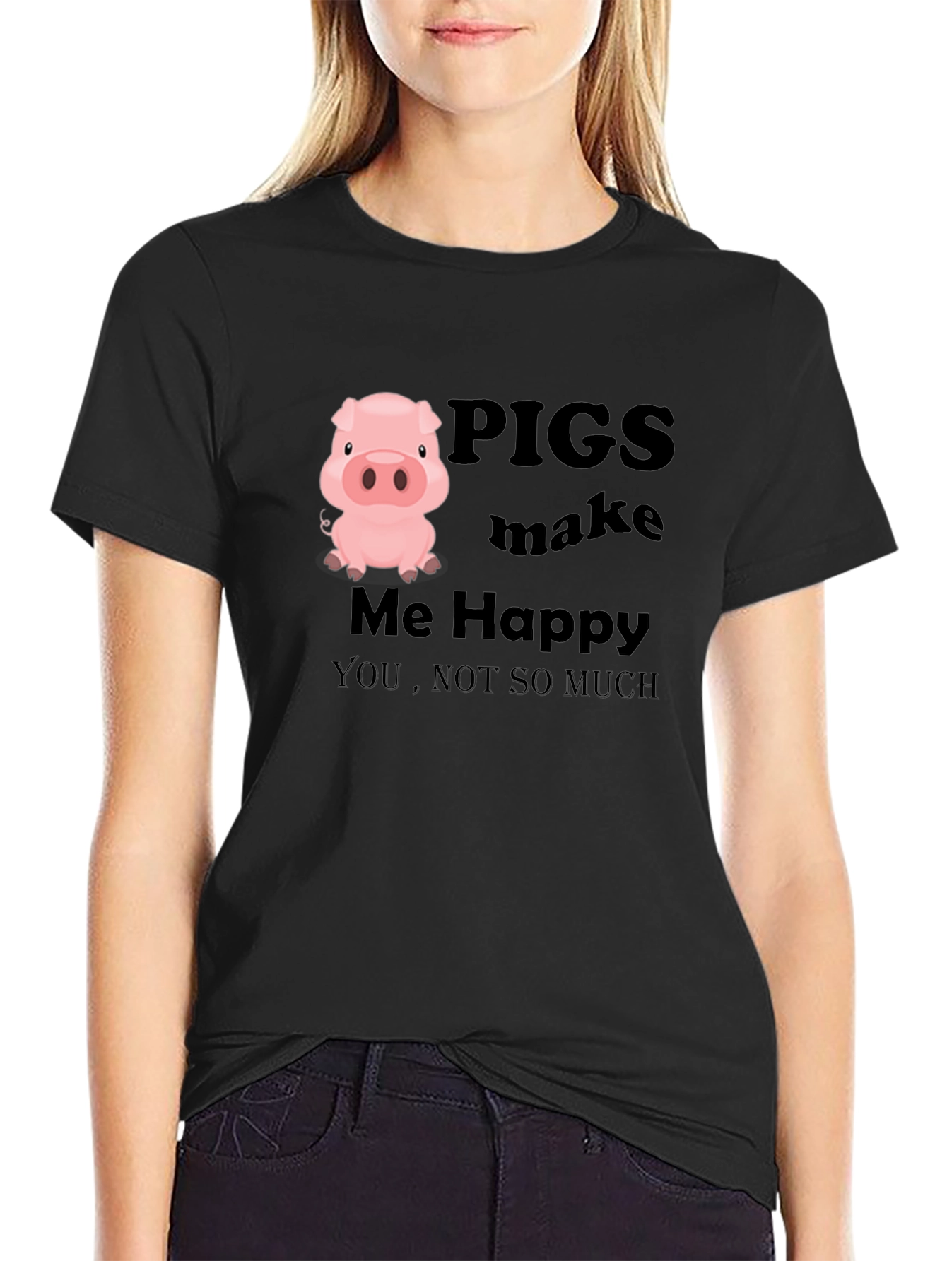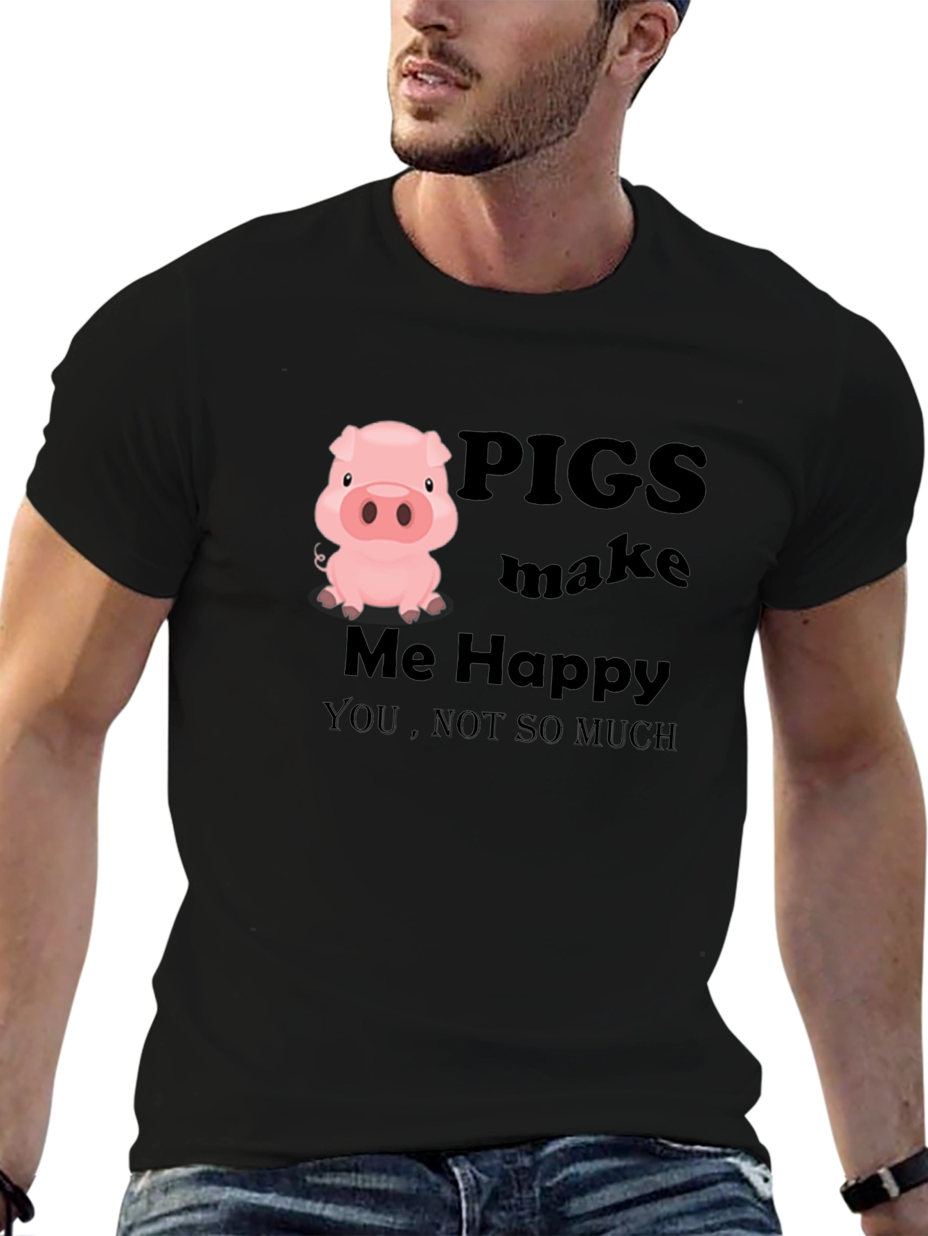 This black T-shirt features a humorous design with a cartoon pig illustration. The text "PIGS make Me Happy, YOU, NOT SO MUCH" is printed in bold letters, making it a fun and lighthearted apparel choice. Crafted from a comfortable-looking fabric, this tee is suitable for casual wear. Its short sleeves and classic crew neck offer a relaxed fit. Perfect for pig lovers or anyone with a playful sense of humor, this T-shirt can be worn for everyday activities, casual outings, or as a statement piece. It's a great way to express your personality and add a touch of whimsy to your wardrobe.