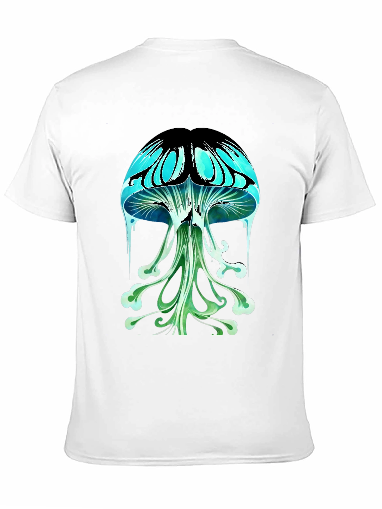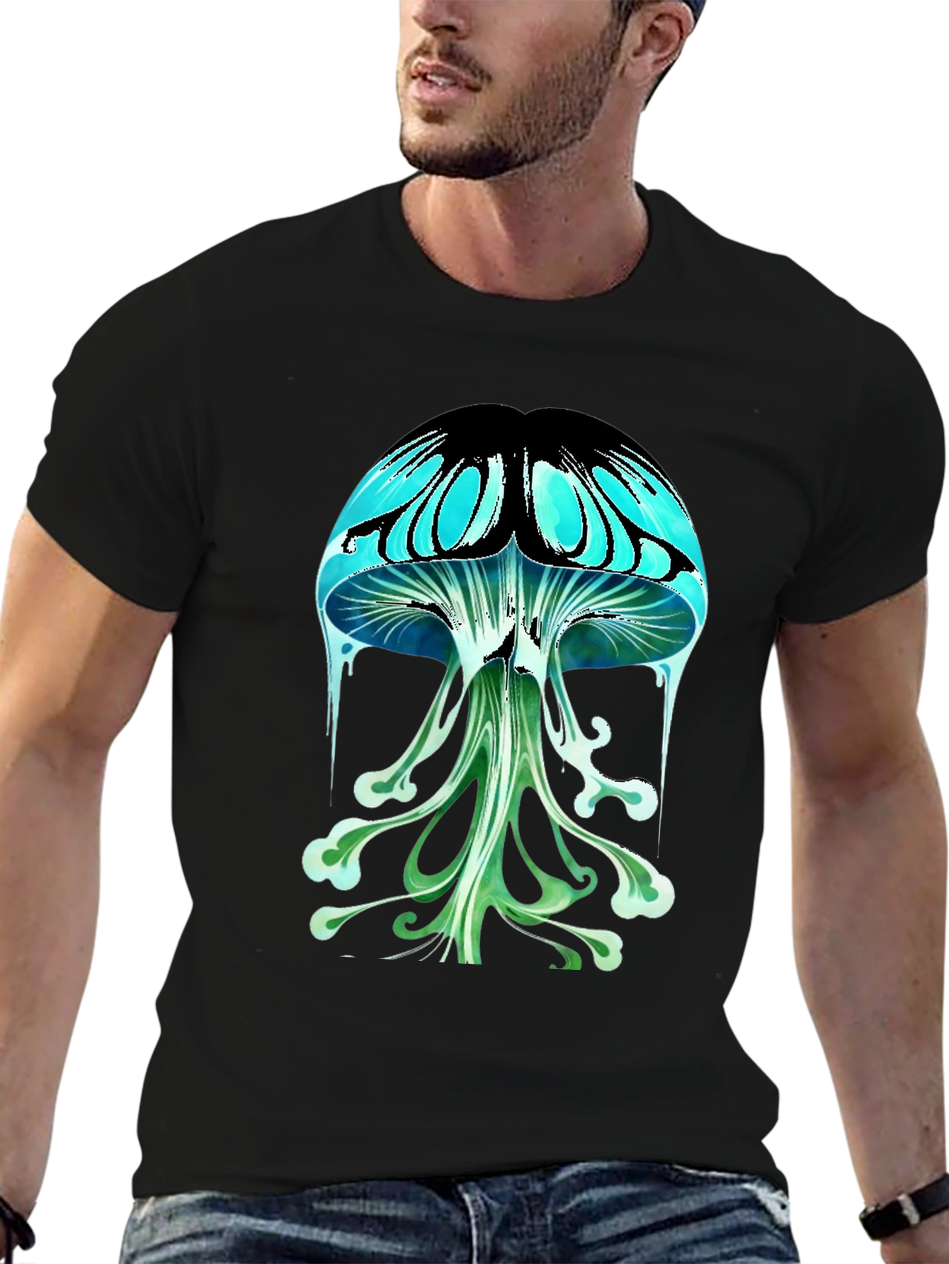 Dive into the depths of psychedelic style with this eye-catching black t-shirt. Featuring a vibrant graphic of a mushroom with a surreal, dreamlike design, this tee is perfect for those who love unique and expressive fashion. The mushroom is rendered in shades of turquoise, blue, and green, with striking black accents that make the design pop. Made from a comfortable-looking fabric, this t-shirt is perfect for casual wear, concerts, festivals, or just expressing your individuality. Stand out from the crowd and showcase your unique style with this captivating tee.
