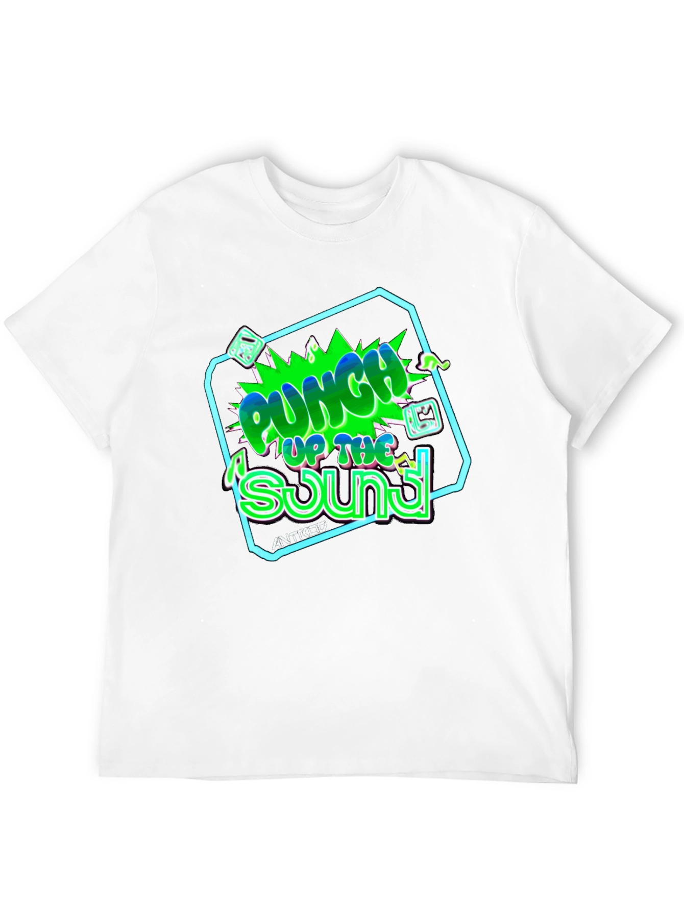 Rock a cool, casual vibe with this black graphic tee. The eye-catching "Punch Up The Sound" design pops with vibrant green, blue, and white hues, framed by a neon outline for that extra edge. It's printed on a soft, breathable fabric for all-day comfort. Perfect for music lovers, casual hangouts, or adding a statement piece to your wardrobe. Express your unique style with this standout tee. Get yours today!