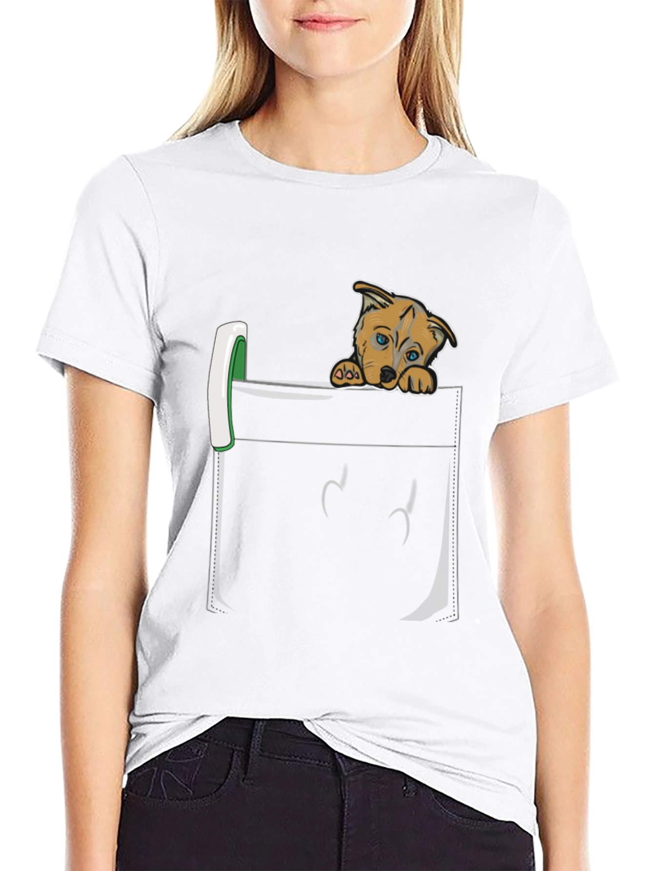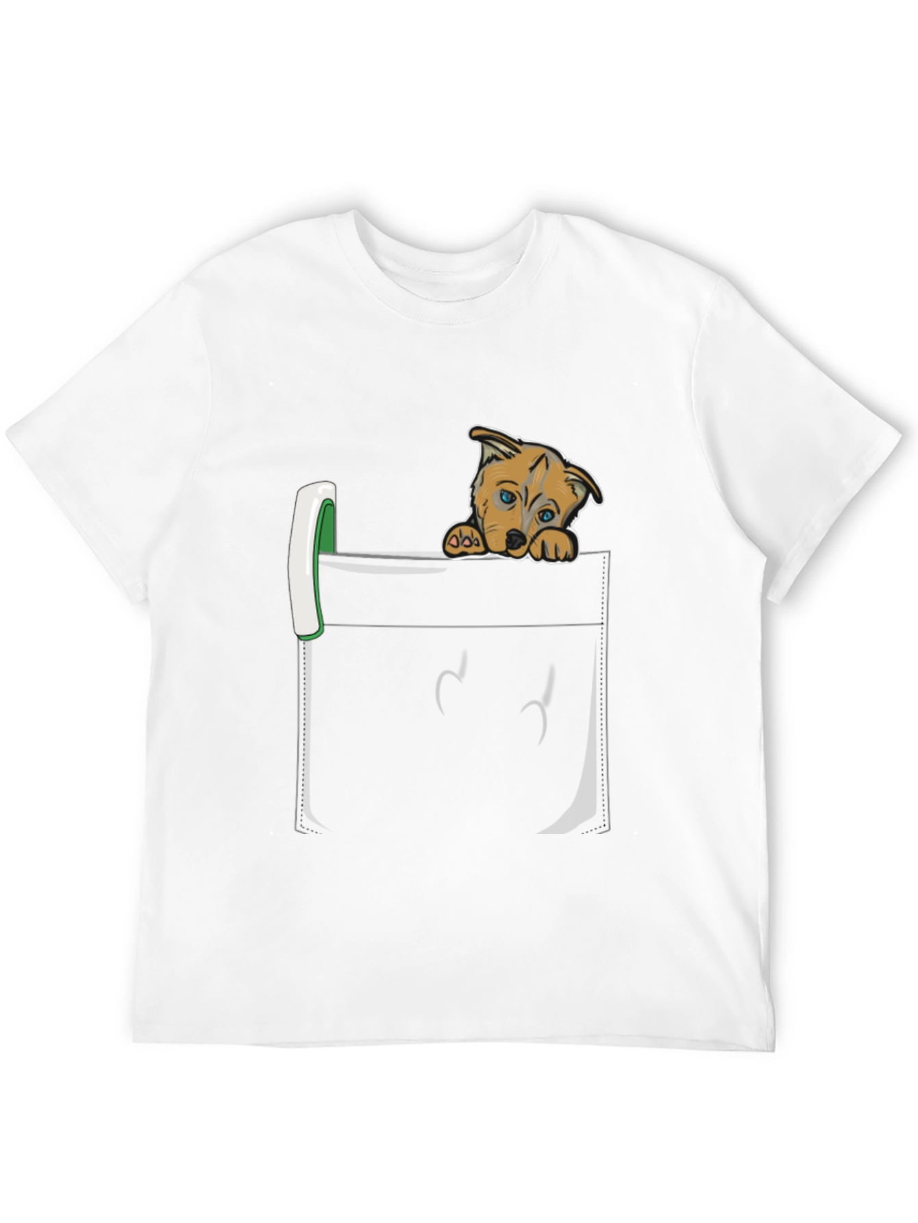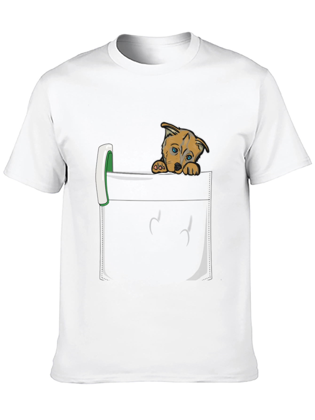 Show off your love for puppies with this charming graphic tee! The shirt features a realistic-looking black pocket design with an adorable cartoon puppy peering out. This crew neck tee is made from comfortable material, making it ideal for everyday wear. The unique design is sure to spark conversations and bring a smile to everyone's face. Perfect for casual outings, dog park visits, or just lounging at home, this t-shirt is a must-have for any dog lover's wardrobe. Get yours today and let your love for pups shine!