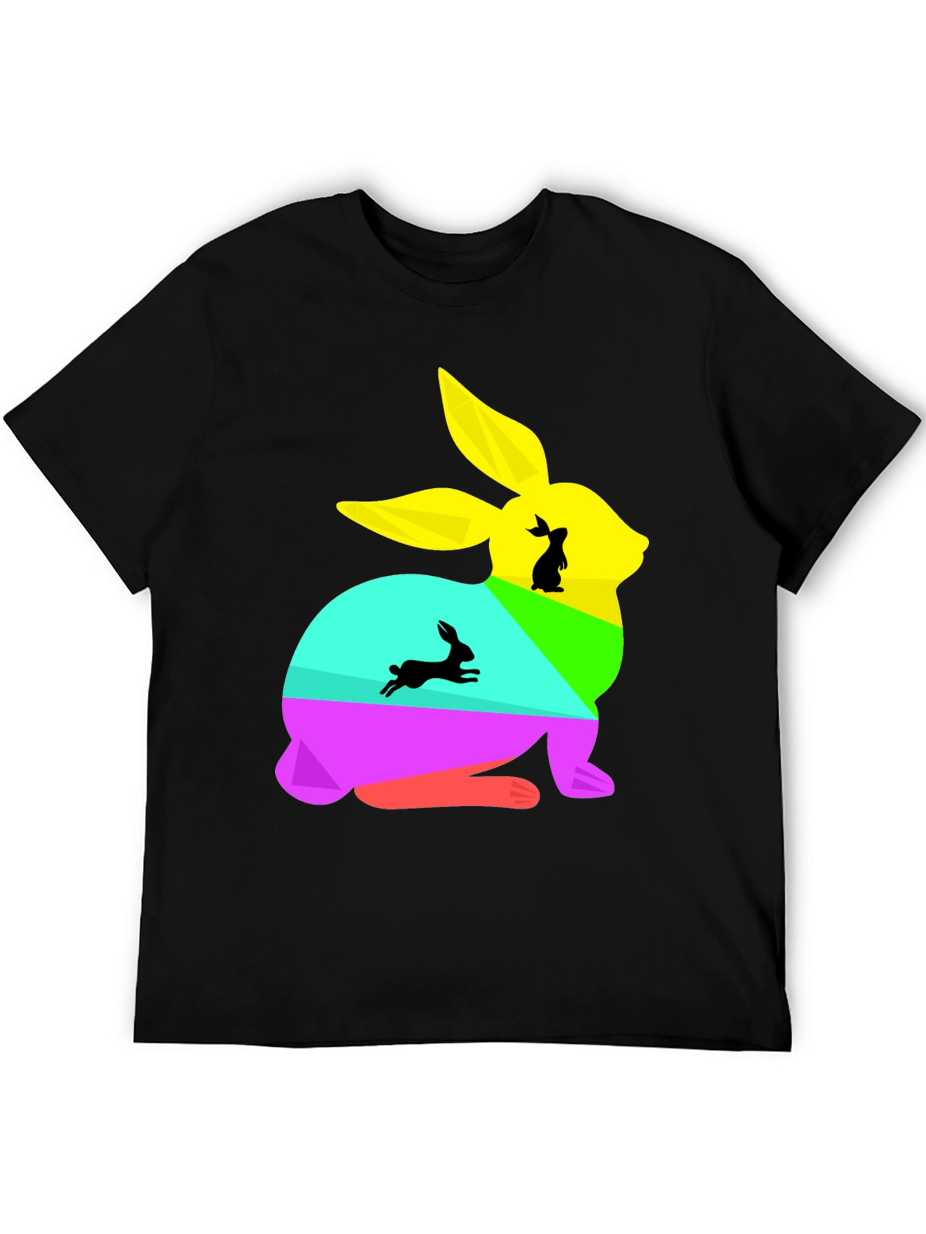 Hop into style with this eye-catching black tee featuring a vibrant, multi-colored rabbit graphic! The rabbit is uniquely designed with a geometric, polygonal style and sections of bright rainbow colors. Within the larger rabbit silhouette, smaller rabbit silhouettes add a playful touch. Made from a comfortable fabric, this t-shirt offers a relaxed fit perfect for casual wear. Show off your fun side and add a pop of color to your wardrobe with this one-of-a-kind bunny tee. Great for spring, Easter, or any day you want to stand out!