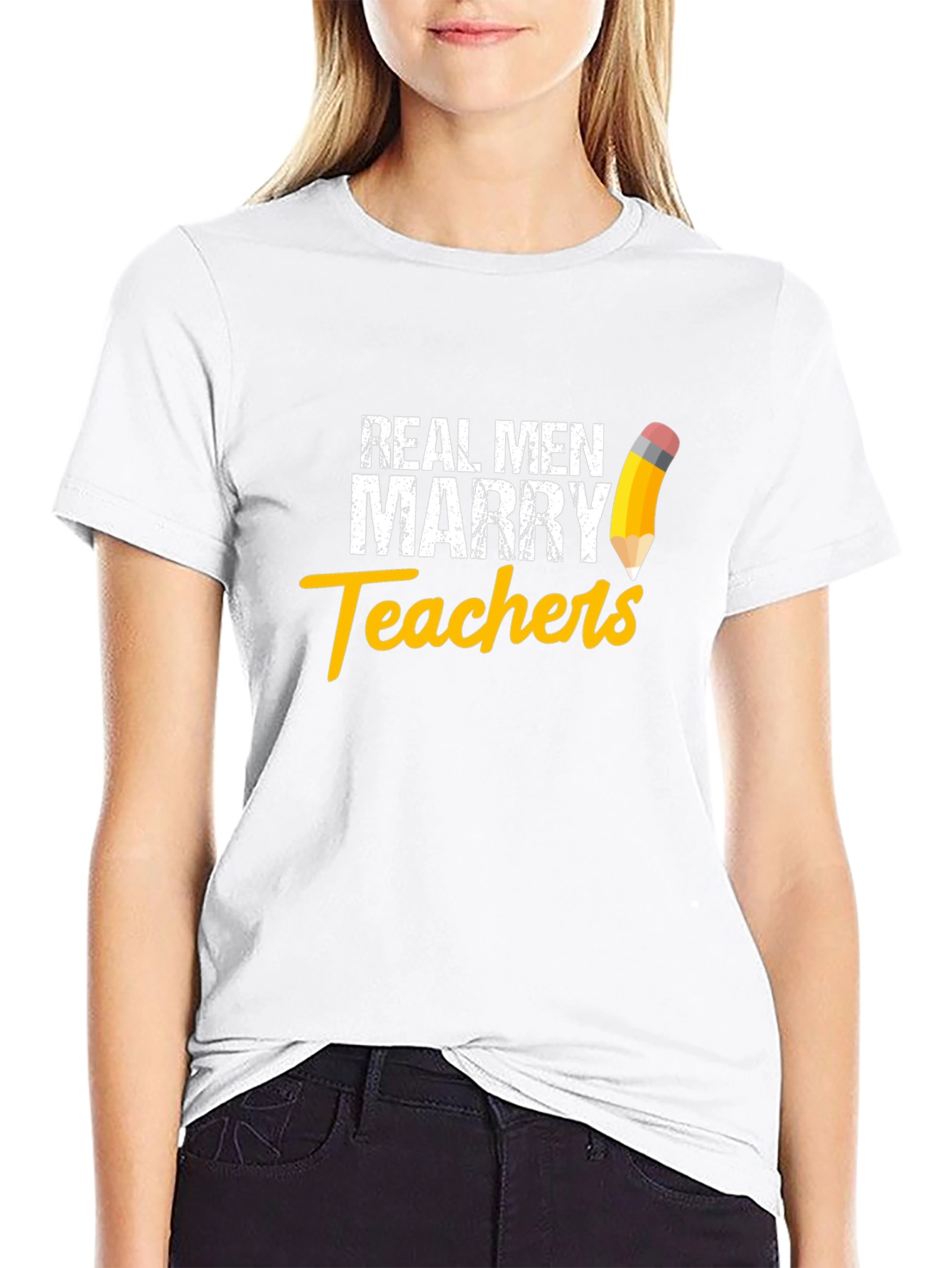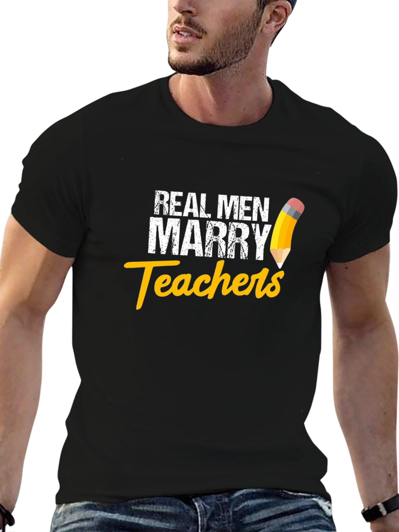 Show your love for teachers with this bold graphic t-shirt. The design features the phrase "Real Men Marry Teachers" in a distressed white font, complemented by a yellow script and playful pencil graphic. Crafted from a comfortable, dark-colored fabric, this tee offers a classic fit suitable for everyday wear. Its eye-catching design makes it a great conversation starter and a perfect gift for educators or their proud partners. Wear it casually or dress it up – this shirt is a stylish way to show your support and appreciation for teachers.