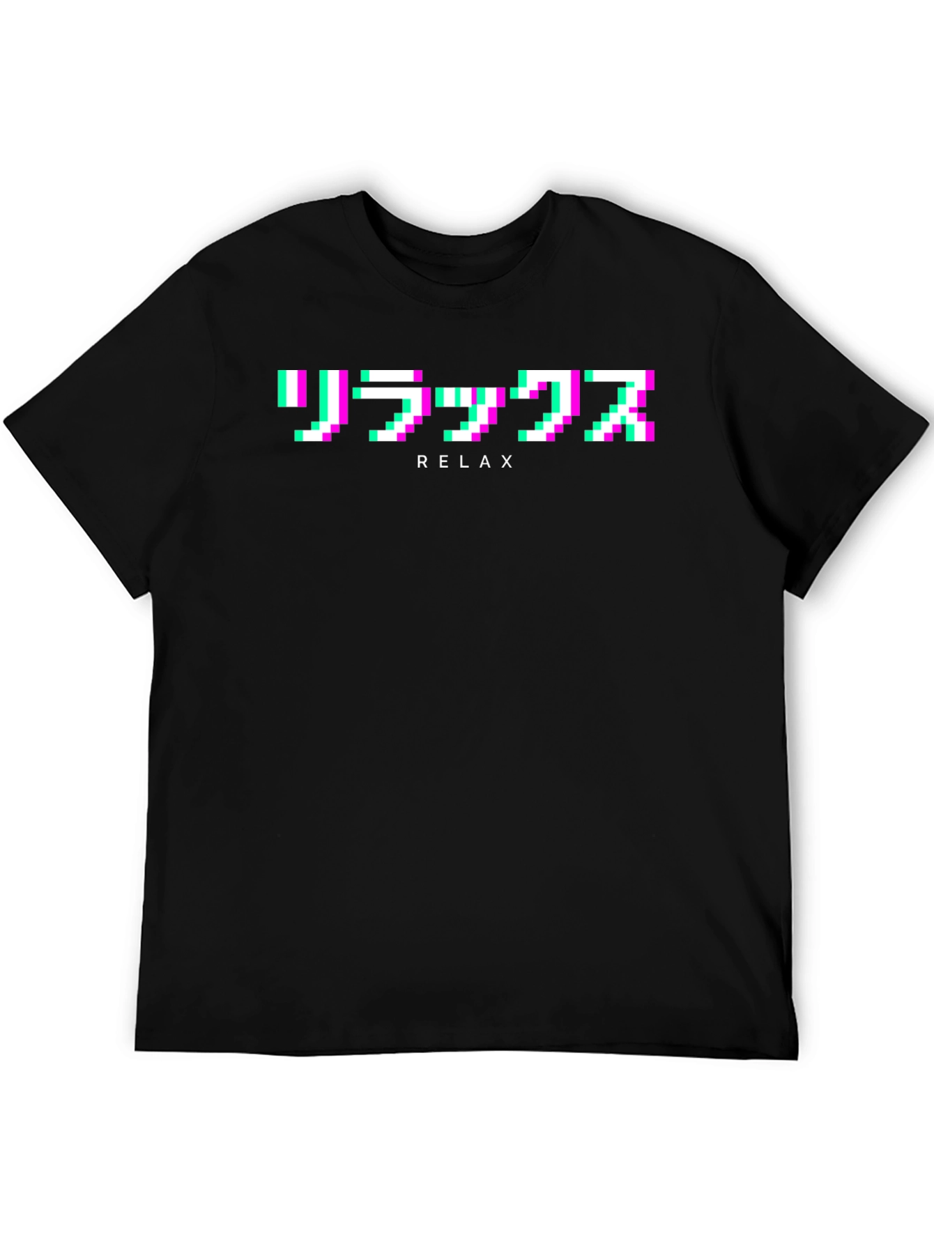 Embrace relaxation with this stylish black t-shirt. The design features a unique Japanese pixel art inspired graphic that says 'Relax'. The text is designed with a modern pink and teal split with a white English translation underneath. Made from comfortable material, this tee is perfect for casual wear, lounging at home, or making a statement in a trendy, laid-back style. Show off your love for Japanese aesthetics and your commitment to chilling out with this one-of-a-kind shirt.