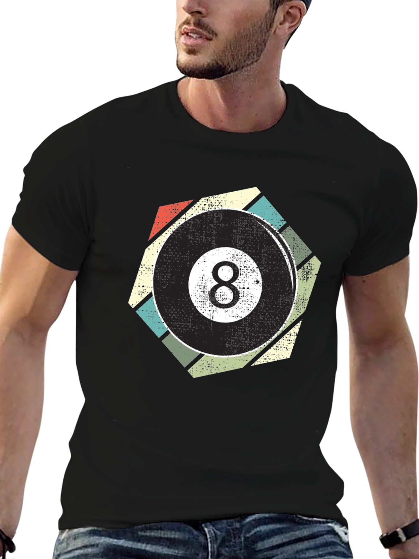 Show off your love for billiards with this vintage-inspired graphic tee! This black t-shirt features a cool retro design of an 8-ball inside a multi-colored geometric shape. The distressed print gives it a worn-in, vintage feel. Made from a soft, comfortable material, this tee is perfect for casual wear or a night out at the pool hall. Makes a great gift for any pool enthusiast or vintage lover! Add a touch of retro cool to your wardrobe today!