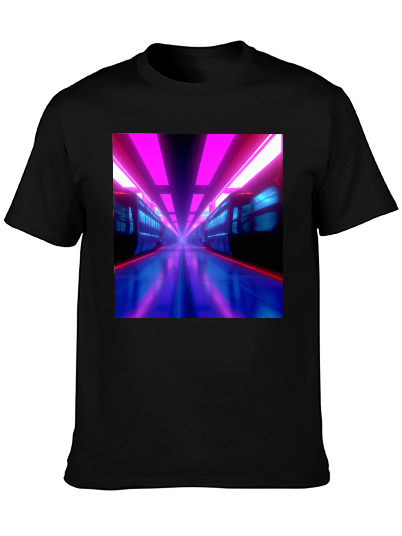 Step into a futuristic world with this eye-catching retro train t-shirt. The design features a vibrant cyberpunk-inspired train station scene, complete with vivid purple and blue neon lights. Made from comfortable, high-quality fabric, this shirt is perfect for everyday wear or as a standout piece for a night out. The unique design is sure to turn heads and spark conversations. Show off your love for retro-futurism with this stylish and comfortable t-shirt. Ideal for casual outings, concerts, or just lounging around at home, this t-shirt offers a unique way to express your personal style.