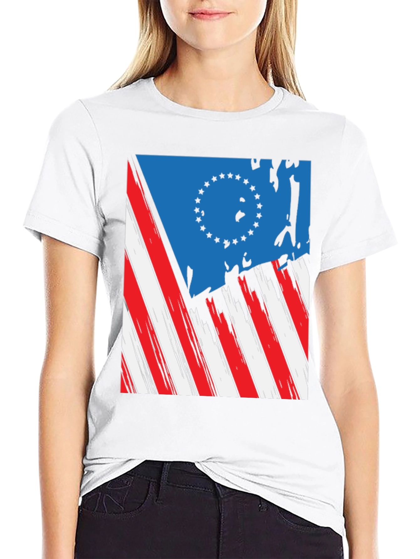 Show off your American pride with this unique graphic tee! The shirt features a stylized, distressed USA flag design, with a blue field of stars over red and white stripes. The print has a cool, vintage vibe. Made from soft, breathable fabric, this comfortable tee is perfect for casual wear. Great for holidays, parties, or everyday wear. A statement piece that displays your patriotism in style. It will easily become your go-to favorite. Available in a classic fit.