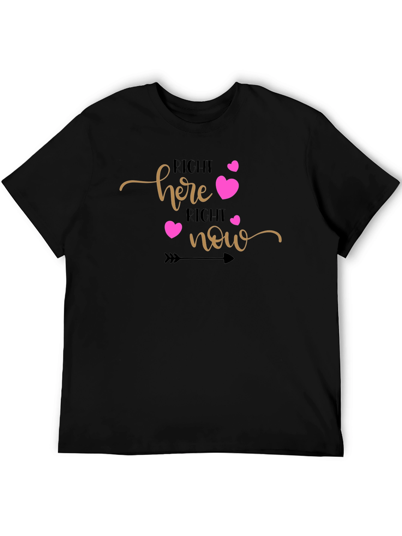 Embrace the present moment with this stylish black graphic tee. Featuring the charming phrase 'Right Here Right Now' in an elegant, flowing font, accented with cute pink heart details. This tee is perfect for everyday wear, casual outings, or as a thoughtful gift. Its classic crew neck and comfortable fit make it a versatile addition to any wardrobe. Show off your positive vibes and stay present in style with this must-have tee. The design also incorporates a subtle arrow detail adding a unique touch to the overall look. Experience comfort and style with this trendy and meaningful tee.