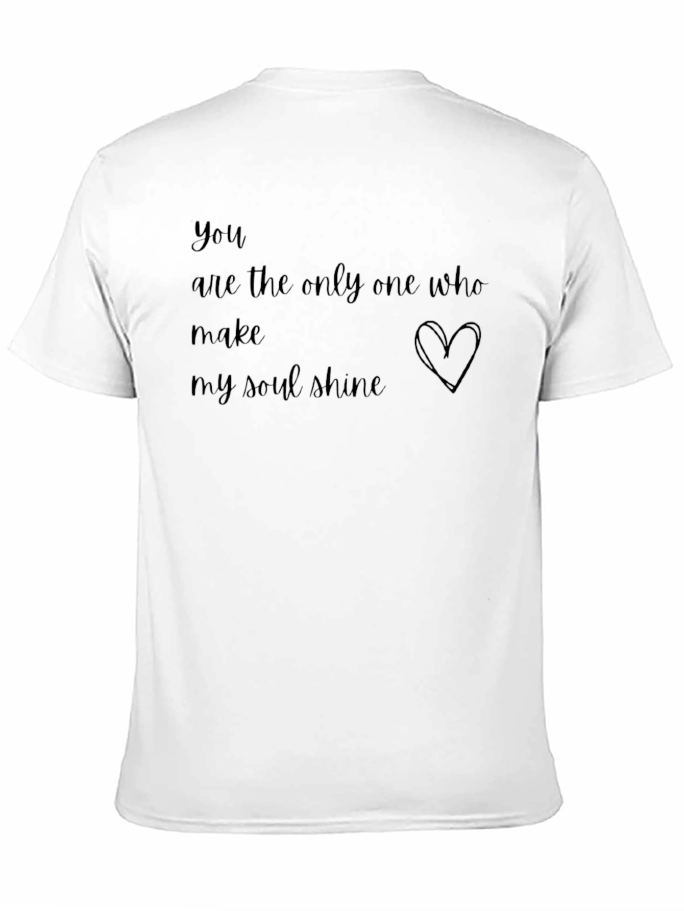This classic black t-shirt features a beautiful and romantic graphic design, making it a stylish statement piece. The words "You are the only one who make my soul shine" are elegantly displayed on the front, accompanied by a delicate heart outline. Made from a soft and comfortable fabric, this shirt is perfect for everyday wear. The timeless design makes it versatile for various occasions - wear it casually with jeans or dress it up with a skirt. Show off your romantic side with this unique and eye-catching t-shirt, sure to spark conversation and spread positive vibes.