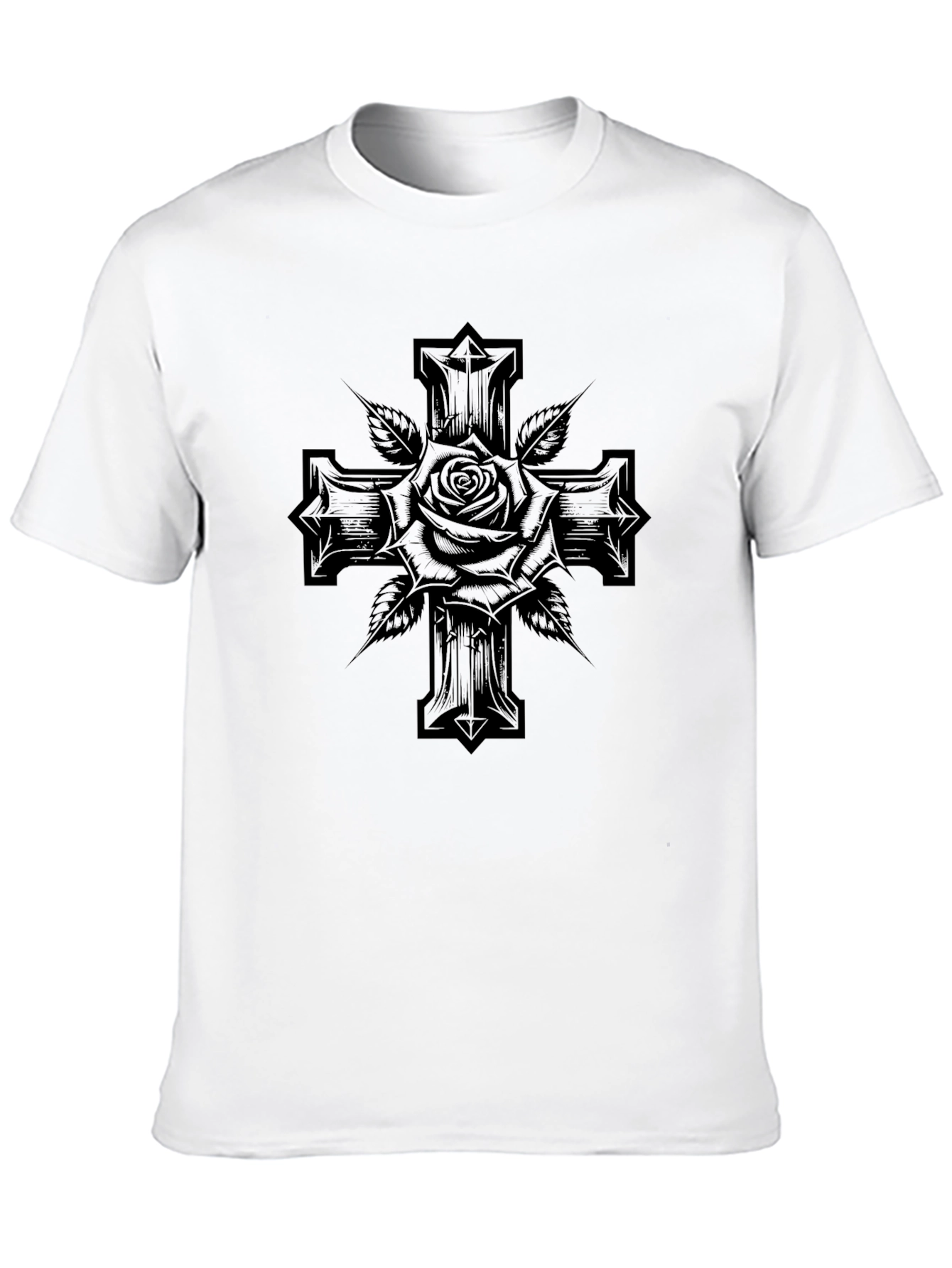 Make a statement with this black graphic tee. The shirt features a bold rose and cross design, giving it a unique and edgy look. The dark graphic stands out against the solid black backdrop, creating a visually striking effect. Made from comfortable materials, this tee is perfect for casual wear. Pair it with jeans or shorts for an effortlessly cool look. This shirt is sure to turn heads and is perfect for anyone who wants to add some unique style to their wardrobe. Get yours today!