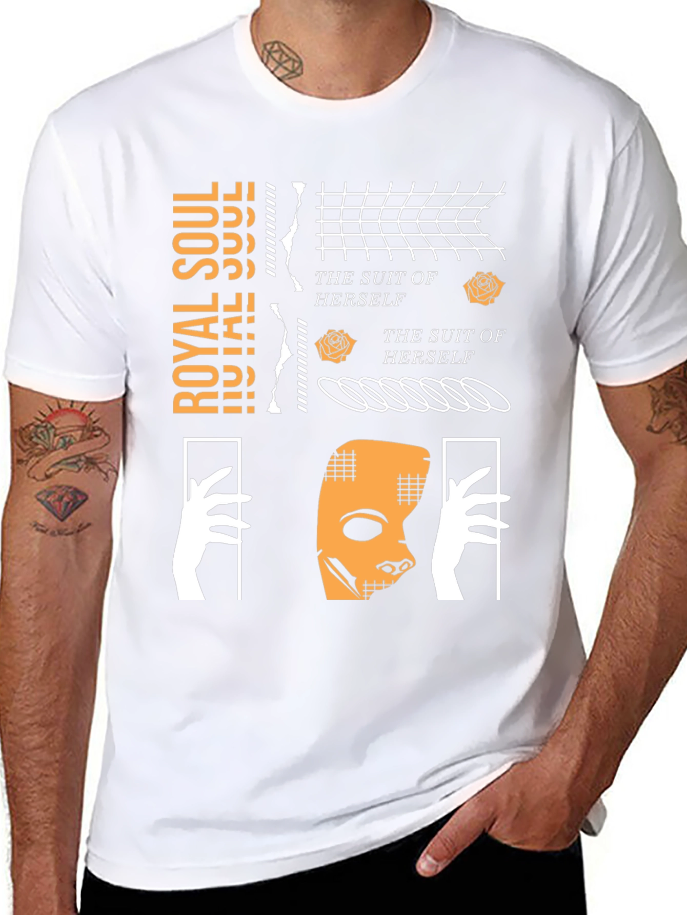 This black t-shirt features a unique and artistic graphic print. The design includes the words "ROYAL SOUL" vertically aligned, alongside abstract patterns, roses, and the phrase "THE SUIT OF HERSELF" repeated. A stylized mask is centered within the design, flanked by graphic hands. The t-shirt appears to be made of a soft, comfortable material, making it ideal for casual wear. Stand out from the crowd with this eye-catching and stylish tee! Perfect for expressing your individuality and adding an artistic touch to your wardrobe. Pair it with jeans, shorts, or a skirt for a trendy, effortless look. This unique tee makes a great conversation starter and a bold fashion statement.