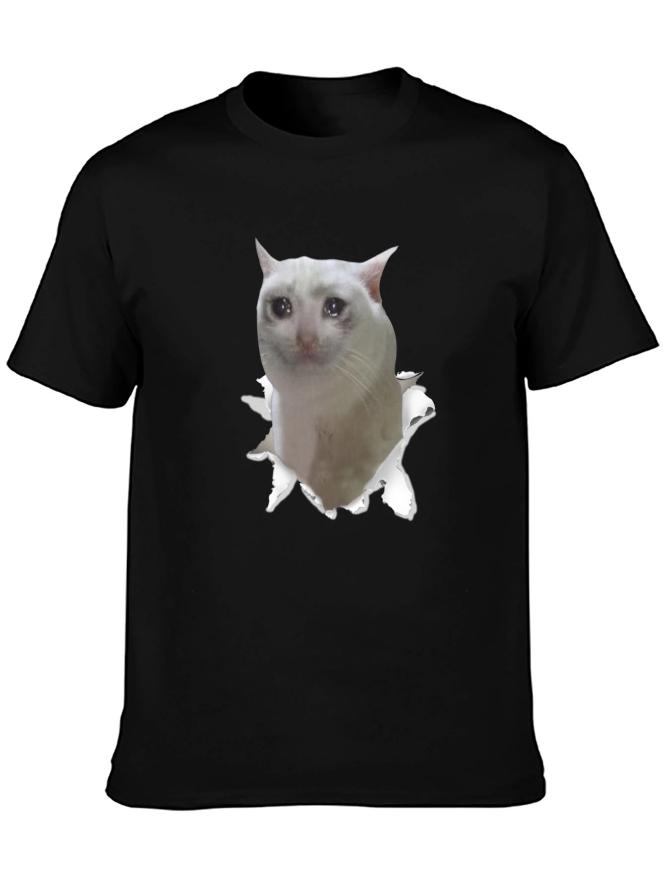 Express your emotions with this unique unisex black t-shirt featuring the iconic sad cat meme. The eye-catching graphic depicts a white cat with tearful eyes, seemingly bursting through a hole in the shirt, creating a 3D illusion effect. Made from a comfortable, breathable fabric, this tee is perfect for casual wear, meme enthusiasts, or anyone who loves a touch of humor in their wardrobe. Show off your quirky side and spark conversations with this conversation-starting piece! Makes a great gift for friends, family, or yourself. Available in various sizes.