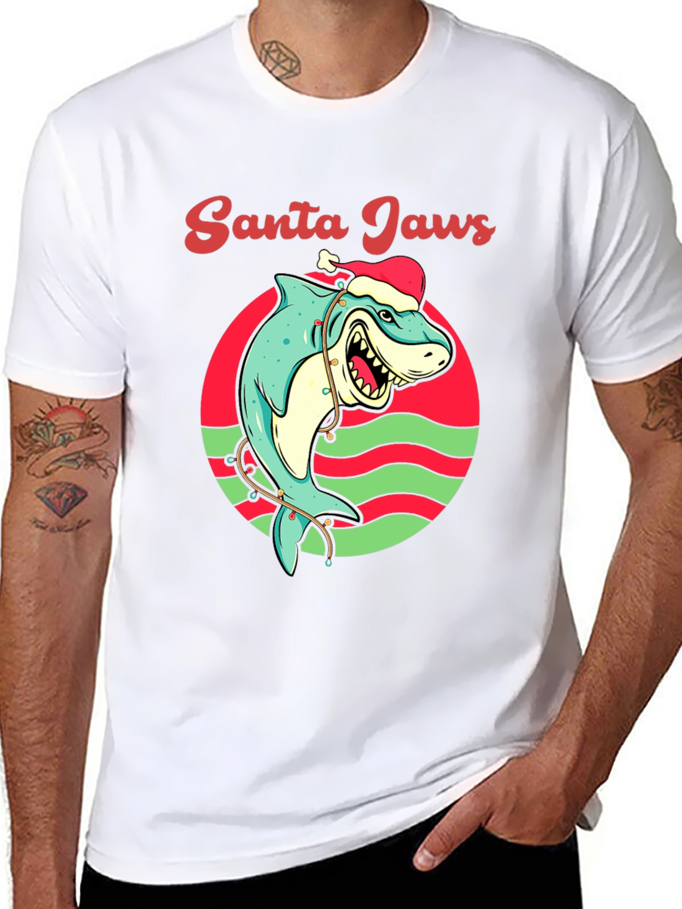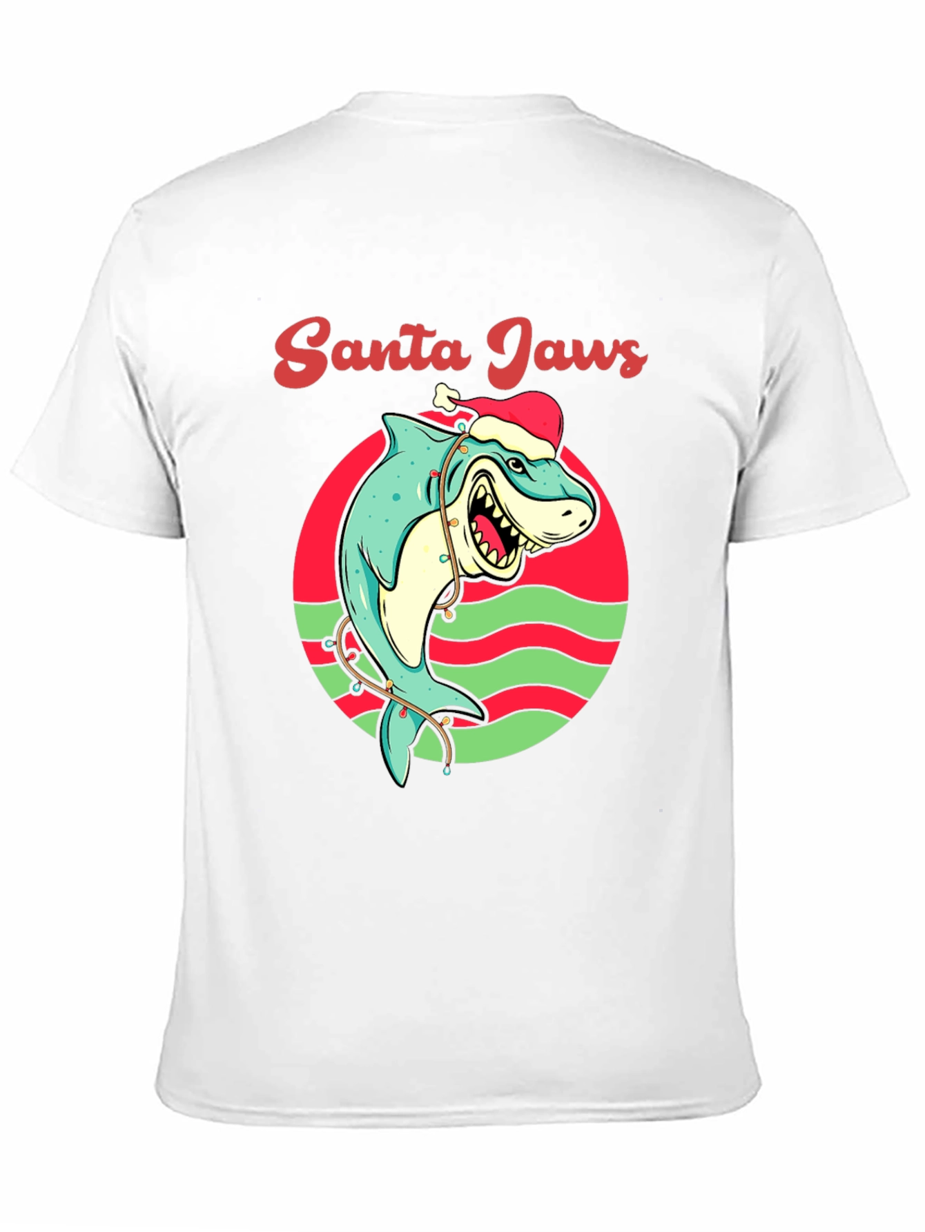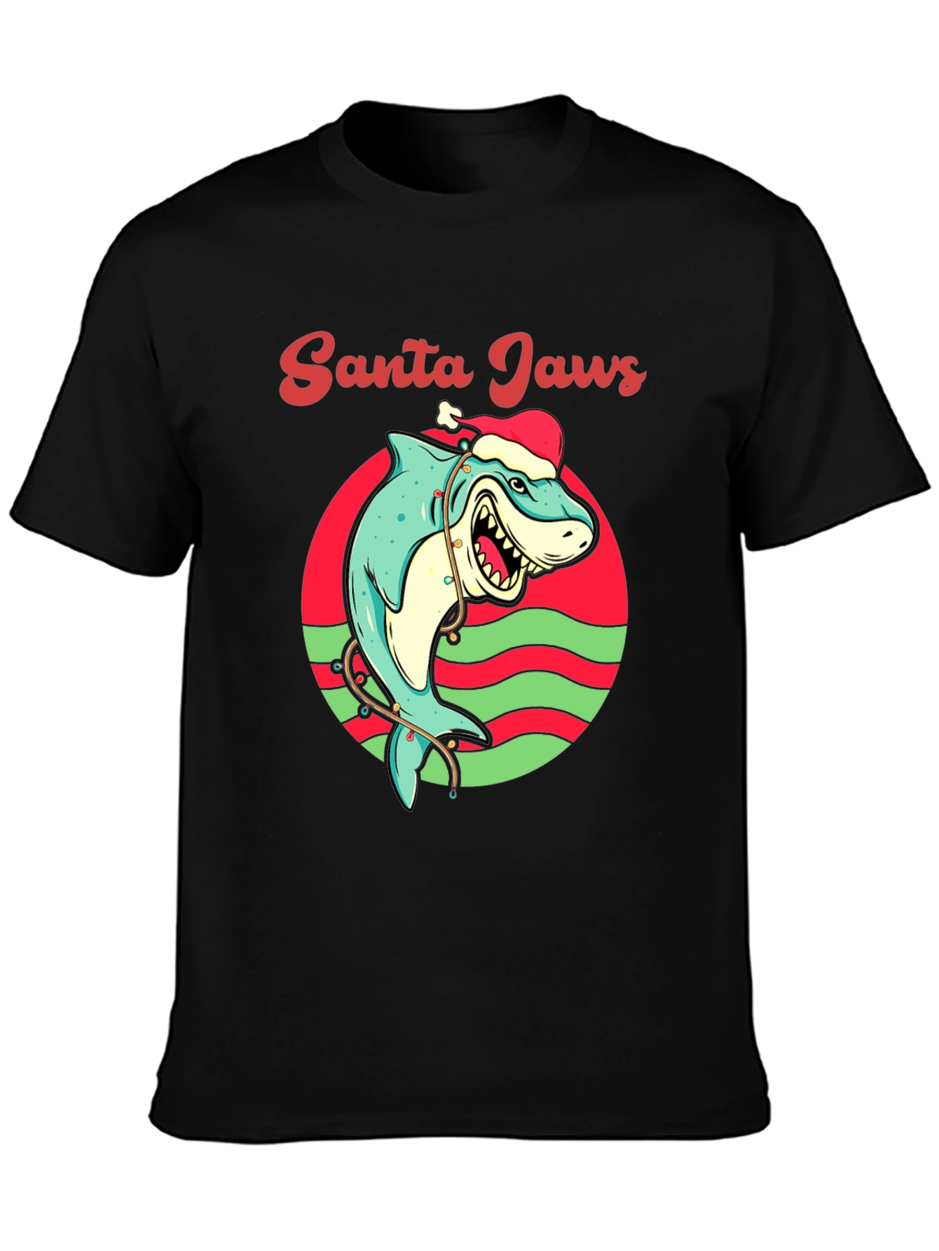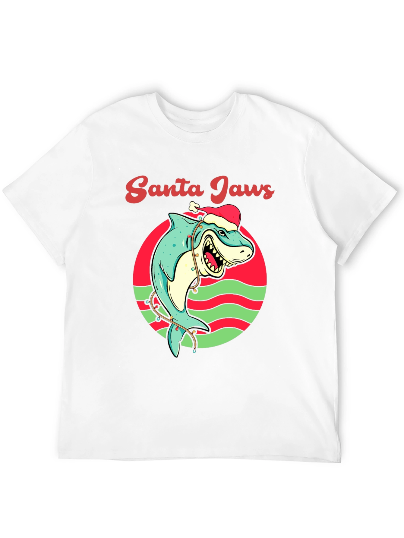 Get ready to make a splash this holiday season with this unique Santa Jaws t-shirt! This eye-catching tee features a cartoon shark wearing a Santa hat, playfully wrapped in Christmas lights, all set against a red and green circular backdrop. The words 'Santa Jaws' are written above the design in a festive script. Made from a soft, breathable fabric, this shirt is perfect for holiday parties, casual outings, or as a fun gift for the shark lover in your life. Show off your quirky Christmas spirit with this attention-grabbing t-shirt!