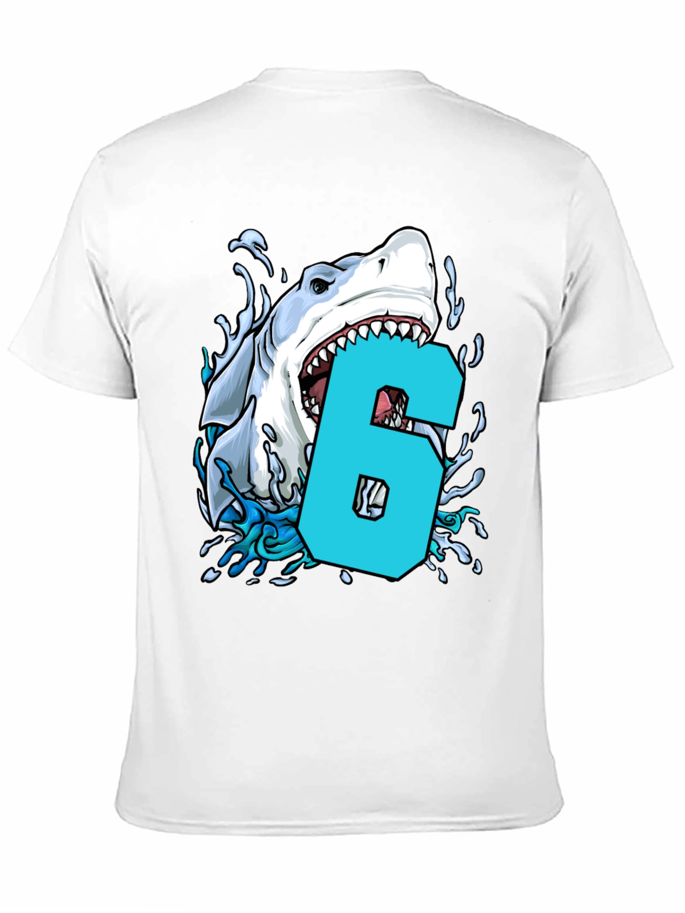 Make a splash with this eye-catching black t-shirt! It features a fearsome shark graphic biting down on a bold, light blue number 6, surrounded by dynamic water splashes. The design is vibrant and playful, making it a fun choice for casual wear. Made from a comfortable-looking material, this tee is perfect for everyday adventures, themed parties, or simply showing off your unique style. Stand out from the crowd with this cool and quirky shark-themed shirt!