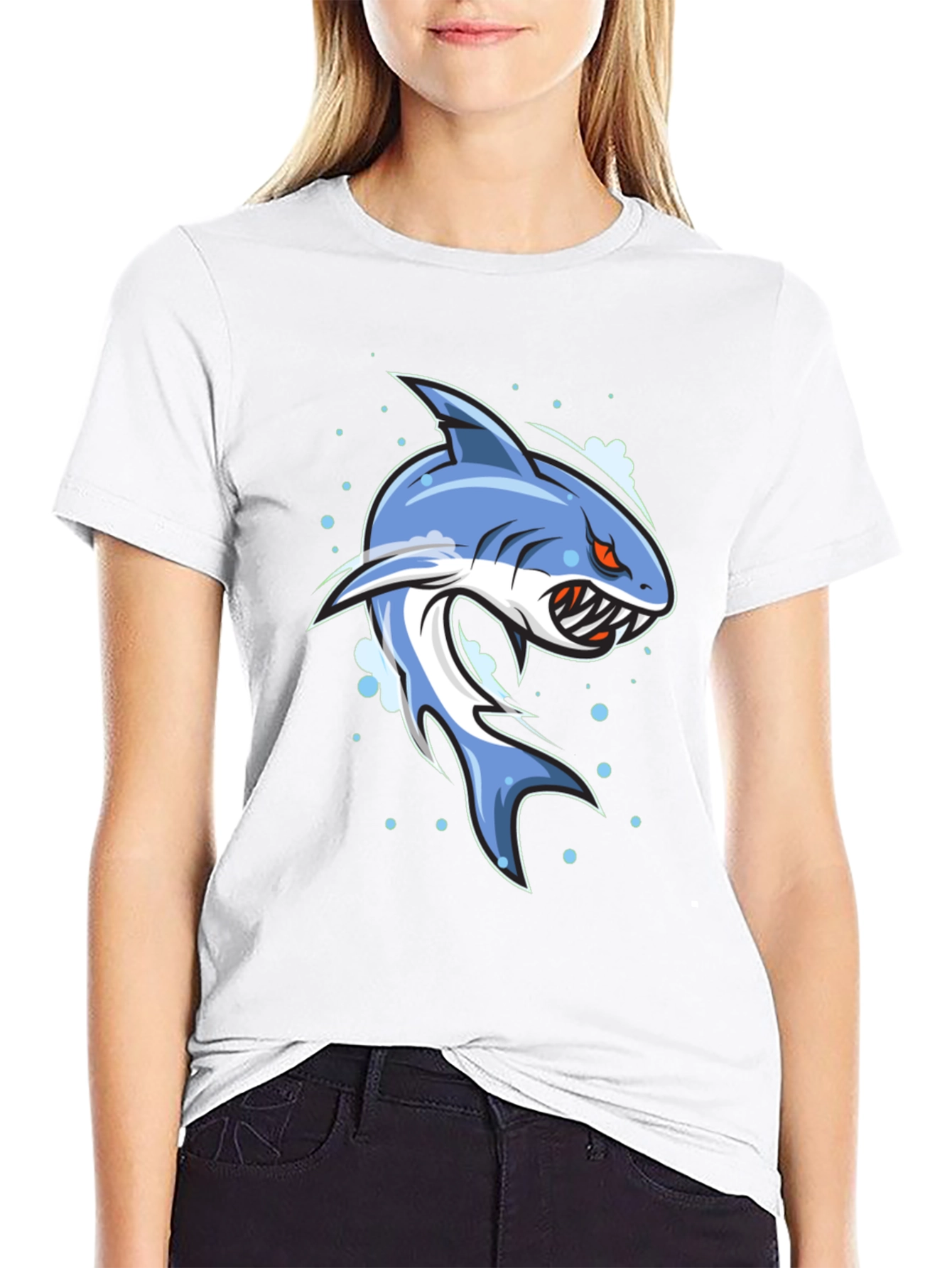 Show off your edgy style with this black t-shirt featuring a striking shark graphic. The design showcases a menacing blue shark with sharp teeth and red eyes, set against a backdrop of bubble accents. Crafted from a comfortable, breathable fabric, this short-sleeve tee offers a relaxed fit. Ideal for casual wear, concerts, or making a statement. Pair it with jeans or shorts for a cool, effortless look. Express your unique personality with this eye-catching shark t-shirt!