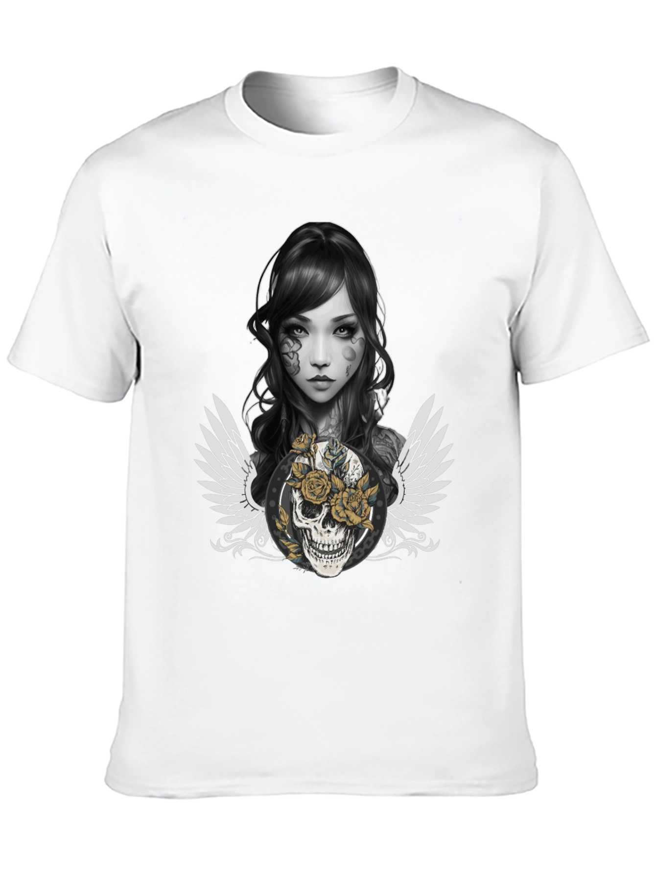 Embrace edgy style with this striking graphic t-shirt. The black tee features a detailed design with a skull adorned with roses, set against stylized wings. The design also showcases a beautiful woman with a haunting gaze. Made from a comfortable, breathable fabric, this tee offers a relaxed fit for everyday wear. Perfect for casual outings, concerts, or adding a bold statement to your wardrobe. Pair it with jeans or shorts for a cool, effortless look. Make a statement and express your individuality with this captivating t-shirt.