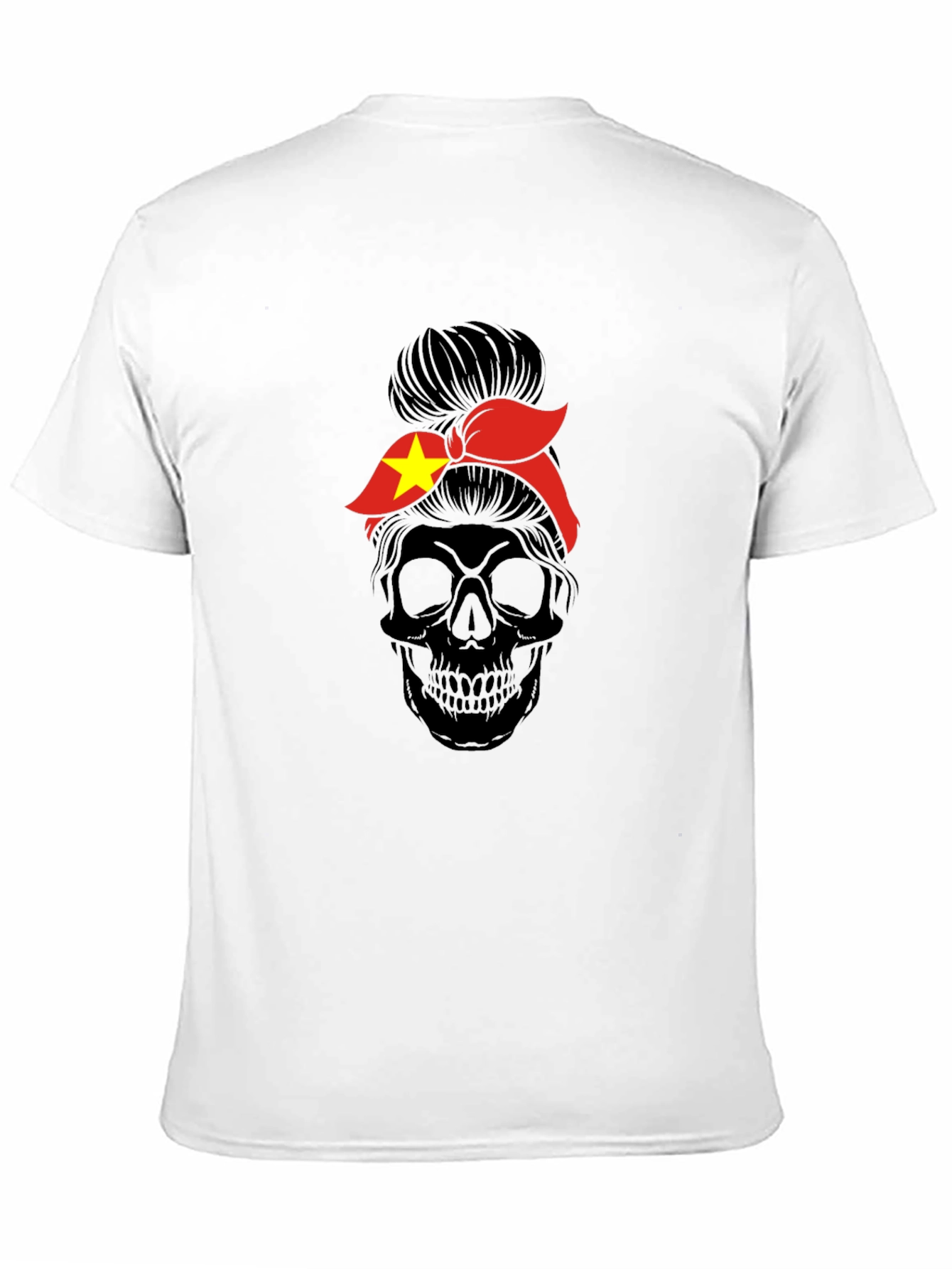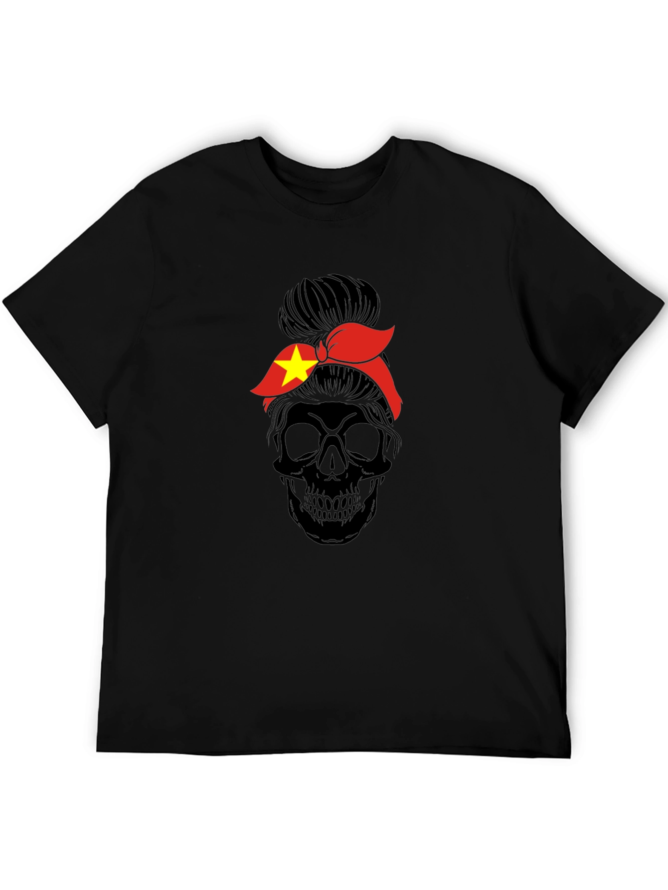 Show off your unique style with this black t-shirt featuring a skull graphic with a messy bun and a Vietnam flag bandana! This eye-catching design blends edgy aesthetics with cultural pride. Made from comfortable, breathable fabric, this tee is perfect for everyday wear. Whether you're hitting the streets, hanging out with friends, or simply expressing yourself, this t-shirt is sure to turn heads. The vivid colors and detailed design make it a standout piece in any wardrobe. Get yours today and make a statement!
