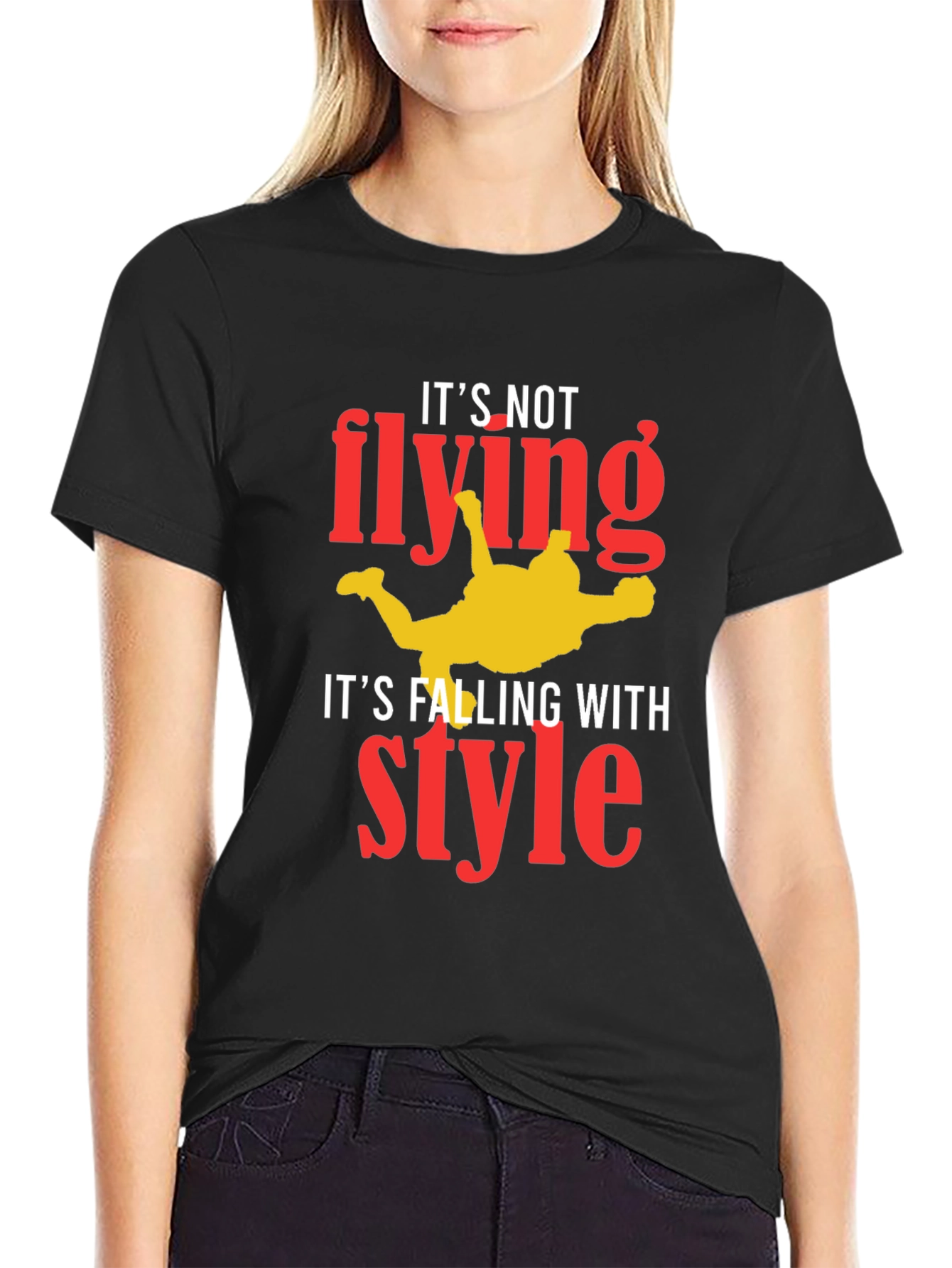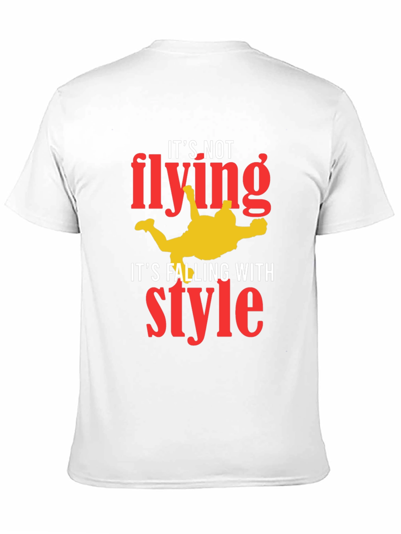 Elevate your everyday style with this eye-catching black t-shirt featuring a bold graphic design. The shirt playfully declares, "It's Not Flying, It's Falling With Style," accompanied by a vibrant skydiving silhouette. The eye-catching text is in red and white, contrasted by a golden skydiver. This stylish tee is made from comfortable, breathable fabric. This unique shirt is perfect for casual outings, skydiving enthusiasts, or anyone who appreciates a touch of humor and adventure in their wardrobe. Pair it with jeans, shorts, or your favorite activewear for a trendy, laid-back look. Make a statement and express your adventurous spirit with this must-have graphic tee!