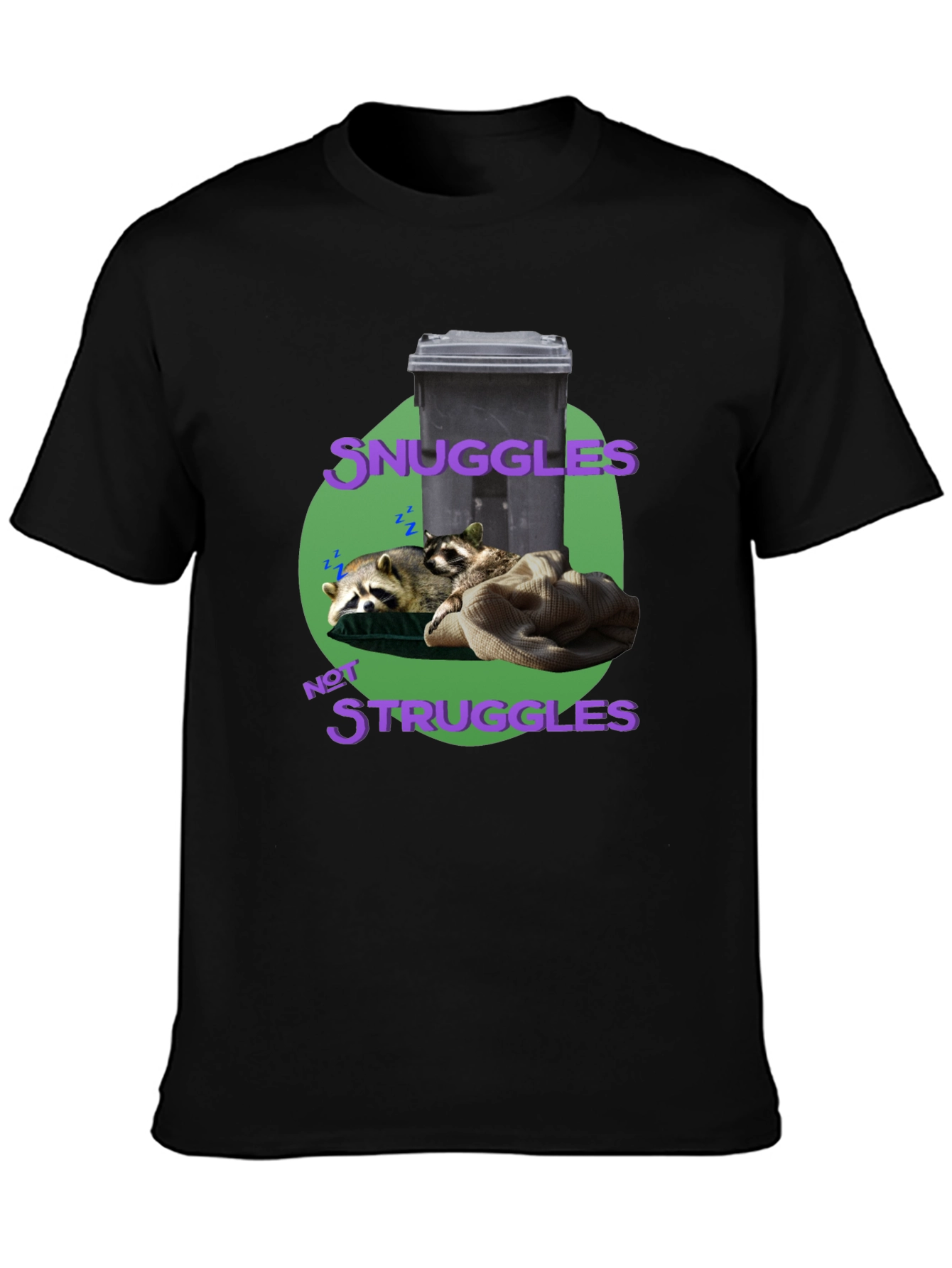 This black t-shirt features a humorous design with the phrase "Snuggles Not Struggles." A green circle highlights two raccoons sleeping peacefully in a pet bed near a trash can. Perfect for animal lovers with a sense of humor, this unique tee adds a playful touch to your wardrobe. Crafted from comfortable materials, it's ideal for casual wear. Stand out from the crowd with this eye-catching design that sparks conversation and brings a smile to anyone's face. Perfect for everyday wear!