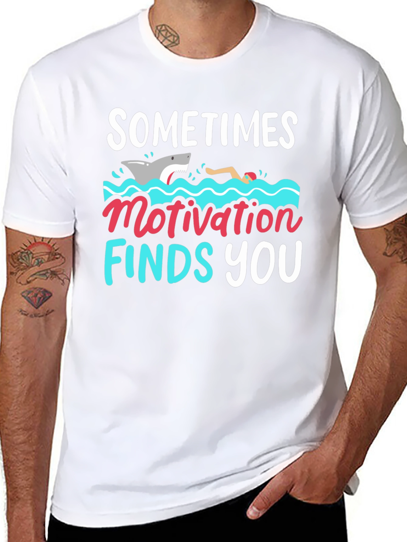 This humorous black t-shirt features a playful graphic of a shark chasing a swimmer. The funny design includes the words "Sometimes Motivation Finds You" in a mix of red, white, and blue fonts, with the shark and swimmer illustrated amidst wavy water. Made from comfortable, breathable fabric, this casual tee is perfect for everyday wear. Show off your sense of humor and unique style with this eye-catching t-shirt. Ideal for casual outings, gym sessions, or lounging at home. This fun t-shirt is bound to get you noticed.