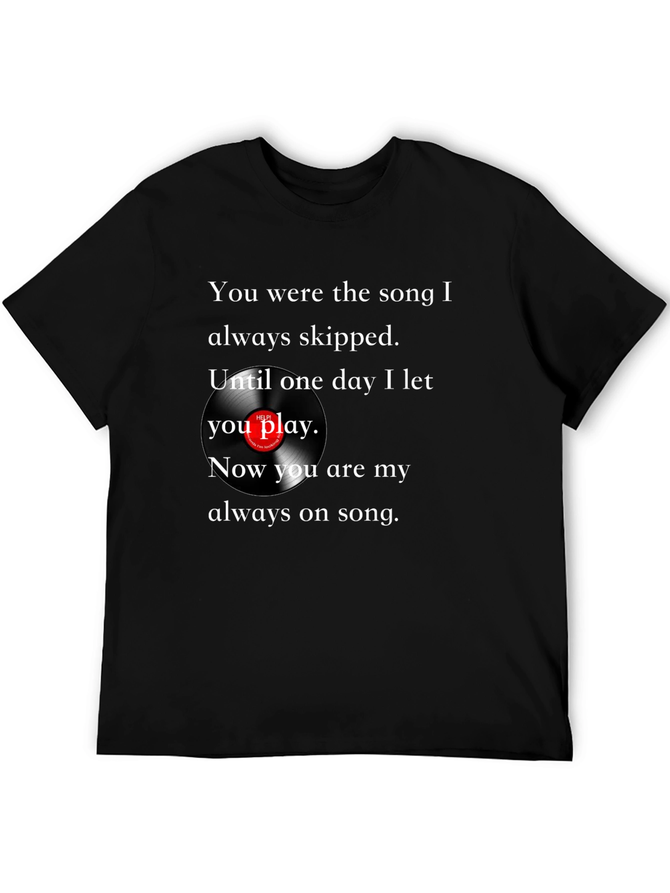 Express your musical journey with this unique t-shirt. Featuring the phrase "You were the song I always skipped. Until one day I let you play. Now you are my always on song", this tee tells a story of rediscovered favorites and lasting connections. The design includes a vinyl record graphic, adding a touch of vintage flair. Made from a soft, breathable fabric, it offers both comfort and style. Ideal for music lovers, romantics, or anyone who appreciates a meaningful message, this t-shirt is perfect for casual wear or as a thoughtful gift. Let your clothing speak volumes with this sentimental and stylish piece.