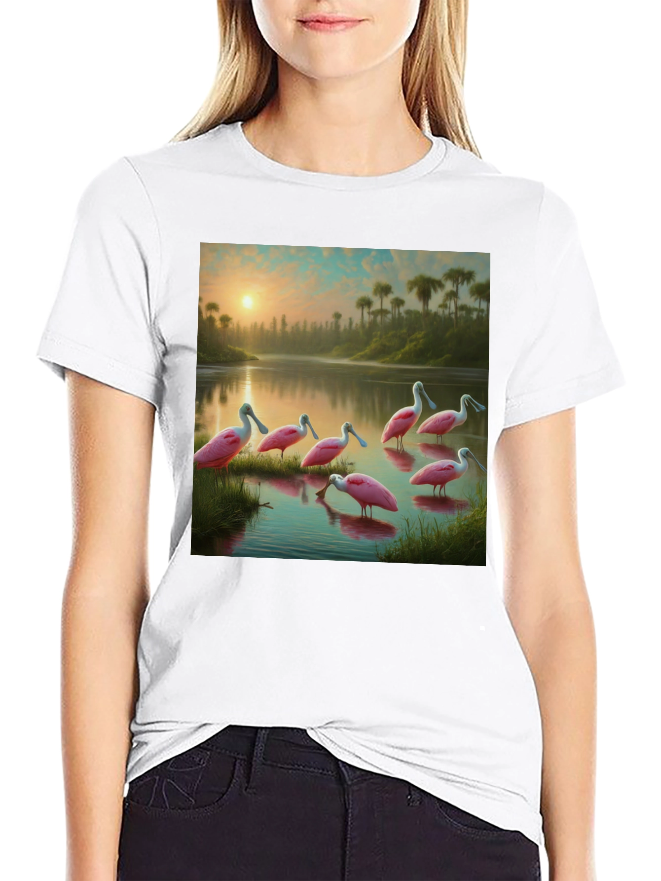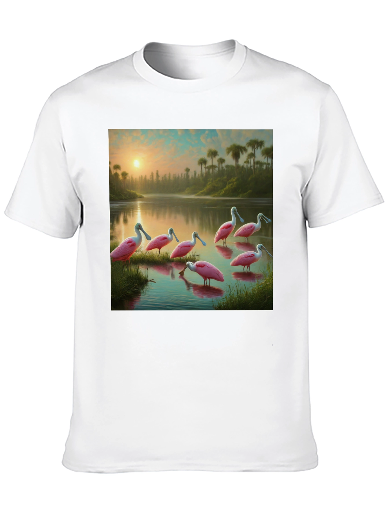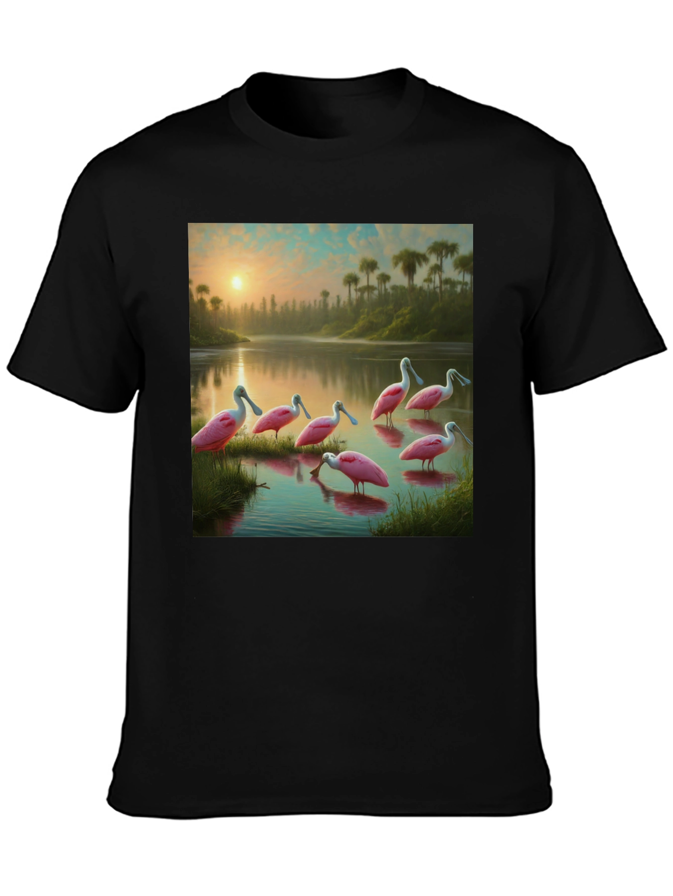 Embrace nature's tranquility with this stylish black t-shirt featuring a stunning image of roseate spoonbills wading in a serene lake at sunset. The shirt showcases a picturesque scene with vibrant pink birds reflected in the calm water. The detailed image captures the essence of Florida's natural beauty, perfect for wildlife enthusiasts and art lovers alike. Made from comfortable, breathable fabric, this t-shirt is ideal for everyday wear, outdoor adventures, or casual gatherings. Express your love for nature and stand out in style with this eye-catching, wearable masterpiece. Get yours today!