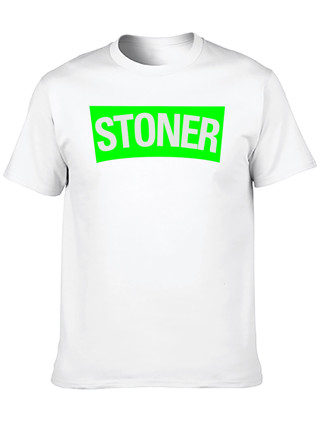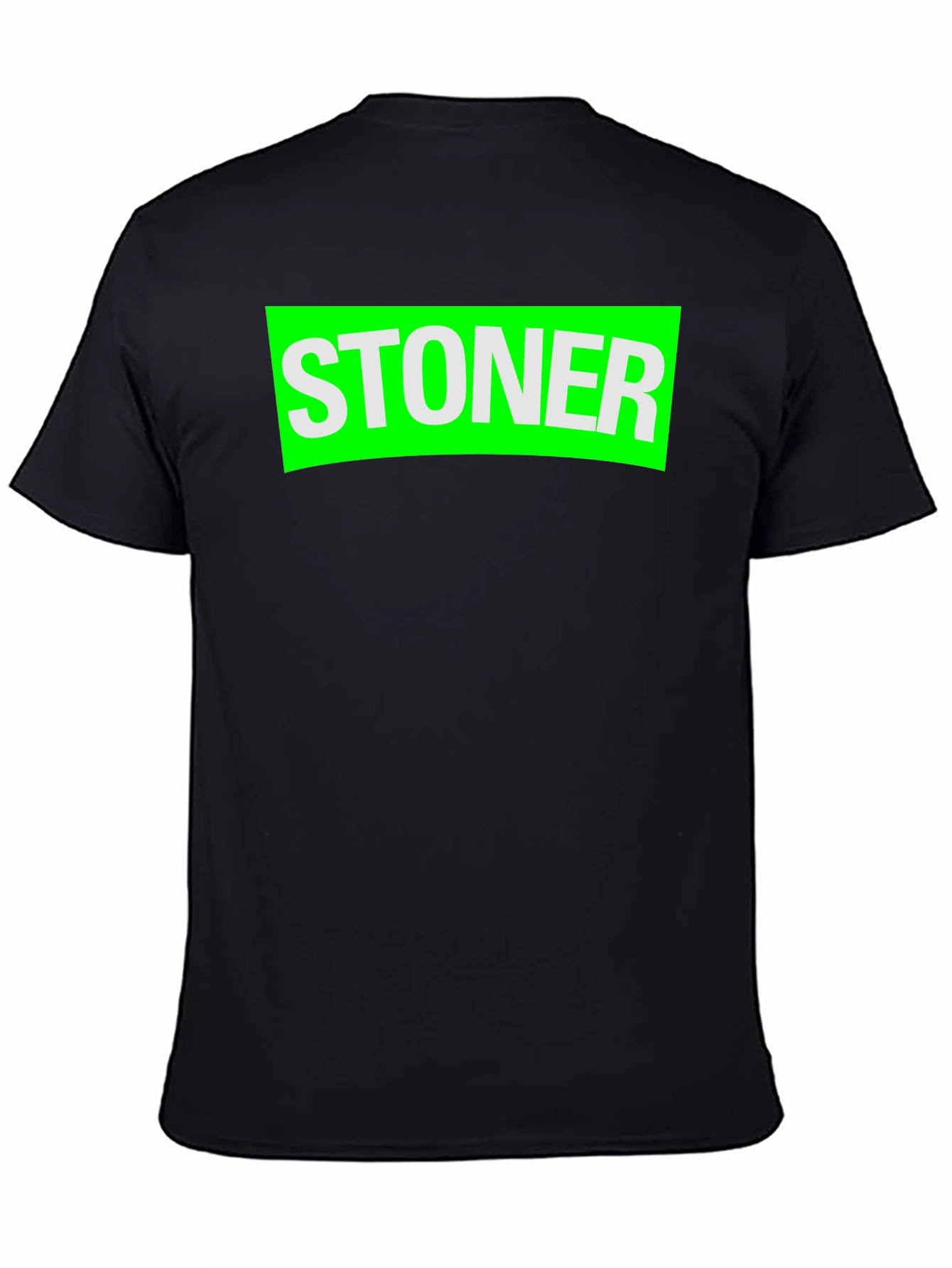 This striking black t-shirt features a bold "STONER" graphic, presented in crisp white letters against a vibrant green rectangular backdrop. The design is eye-catching and contemporary, perfect for making a statement. Made from what appears to be a comfortable, breathable cotton blend, this tee offers both style and ease of wear. The classic short-sleeve design makes it versatile for casual outings, concerts, or lounging. Show off your individuality with this unique and edgy graphic tee that is sure to turn heads.