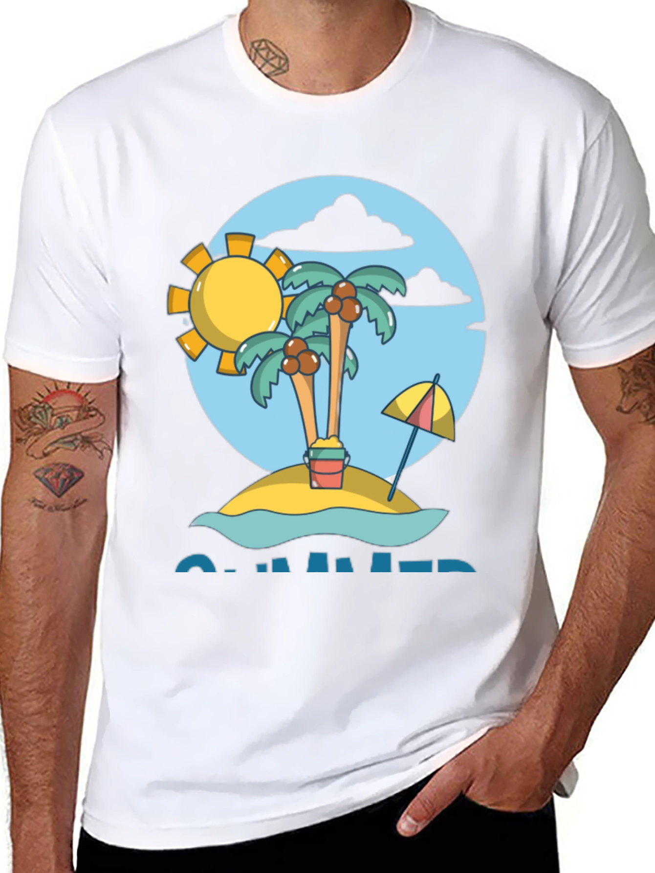 Embrace the summer vibes with this stylish black graphic t-shirt. The tee features a vibrant design with a cartoon island scene complete with palm trees, a sunny beach, and a blue sky backdrop. Perfect for casual wear, this shirt is a fun and eye-catching addition to your wardrobe. Made from a soft, breathable fabric, it ensures comfort all day long. Wear it to the beach, a summer party, or just relaxing at home. This unique t-shirt is sure to be a conversation starter!