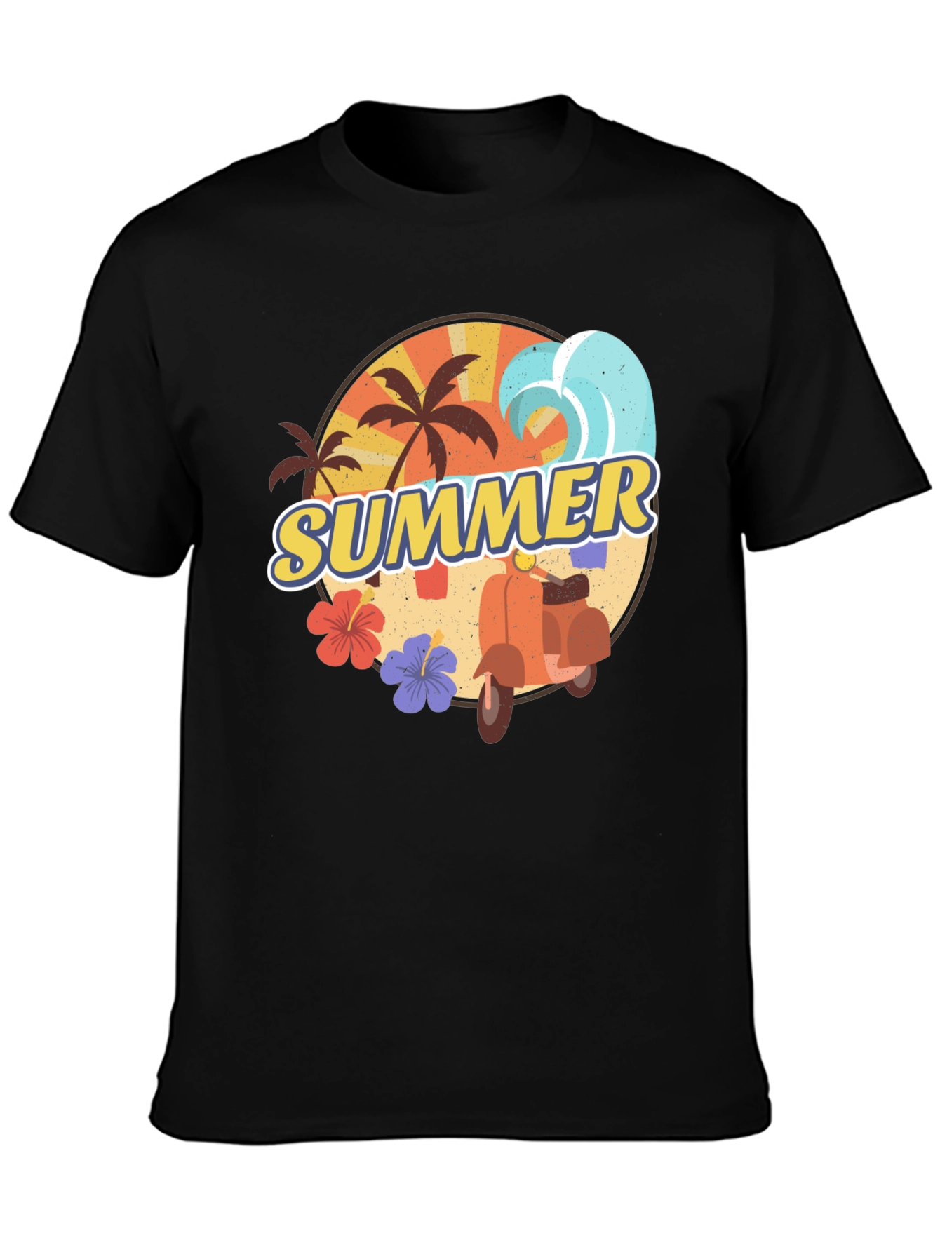 Embrace the summer spirit with this stylish black t-shirt! Featuring a vibrant graphic design showcasing palm trees, a classic scooter, and the word "Summer" in a retro font, this tee is perfect for casual wear. The warm, sunset-inspired color palette adds a touch of vintage charm. Made from a soft, comfortable fabric, it's ideal for beach days, summer festivals, or simply lounging around. Stand out with this unique piece that captures the essence of summer fun and adventure. Get yours now and let the good times roll!