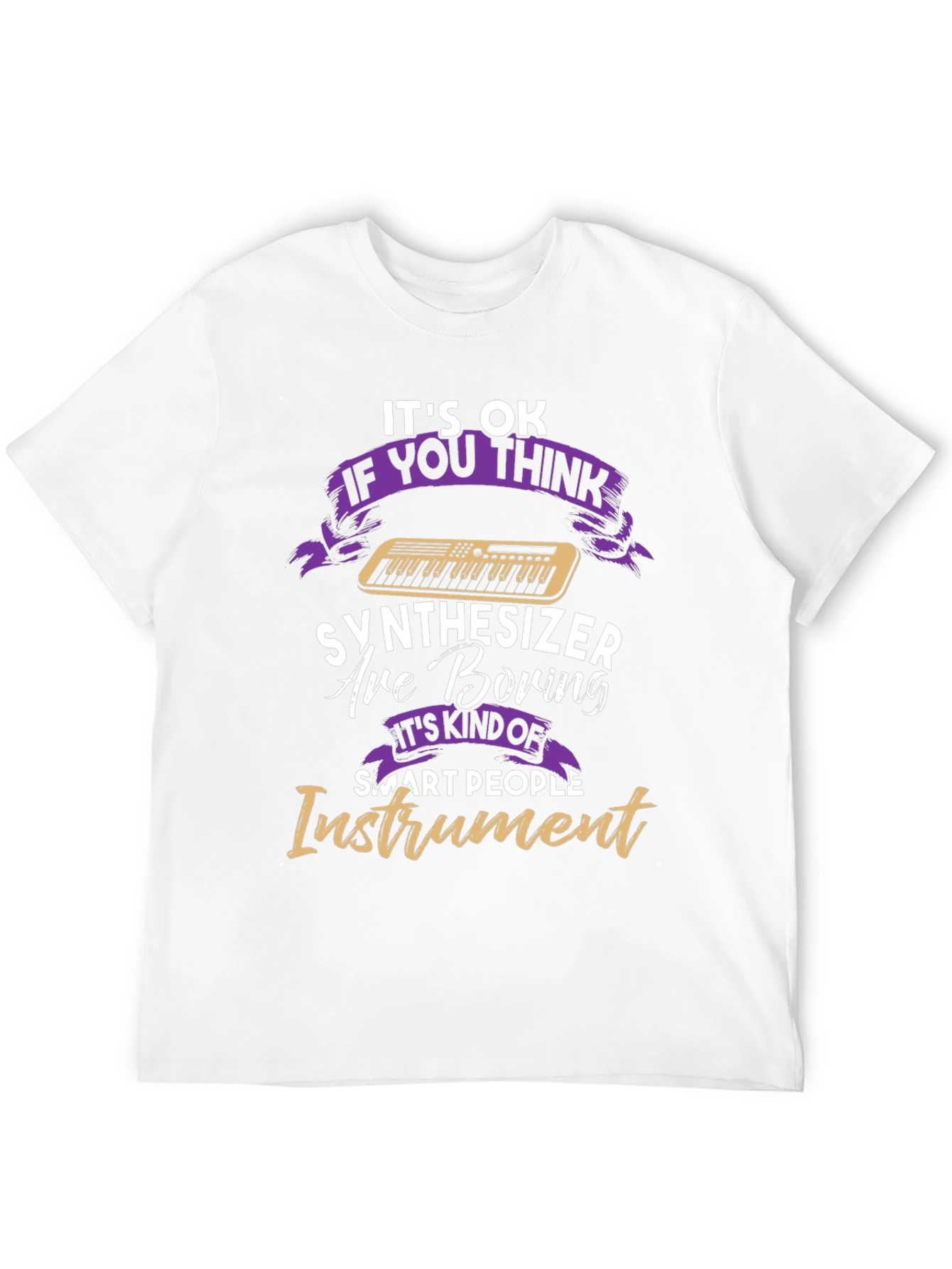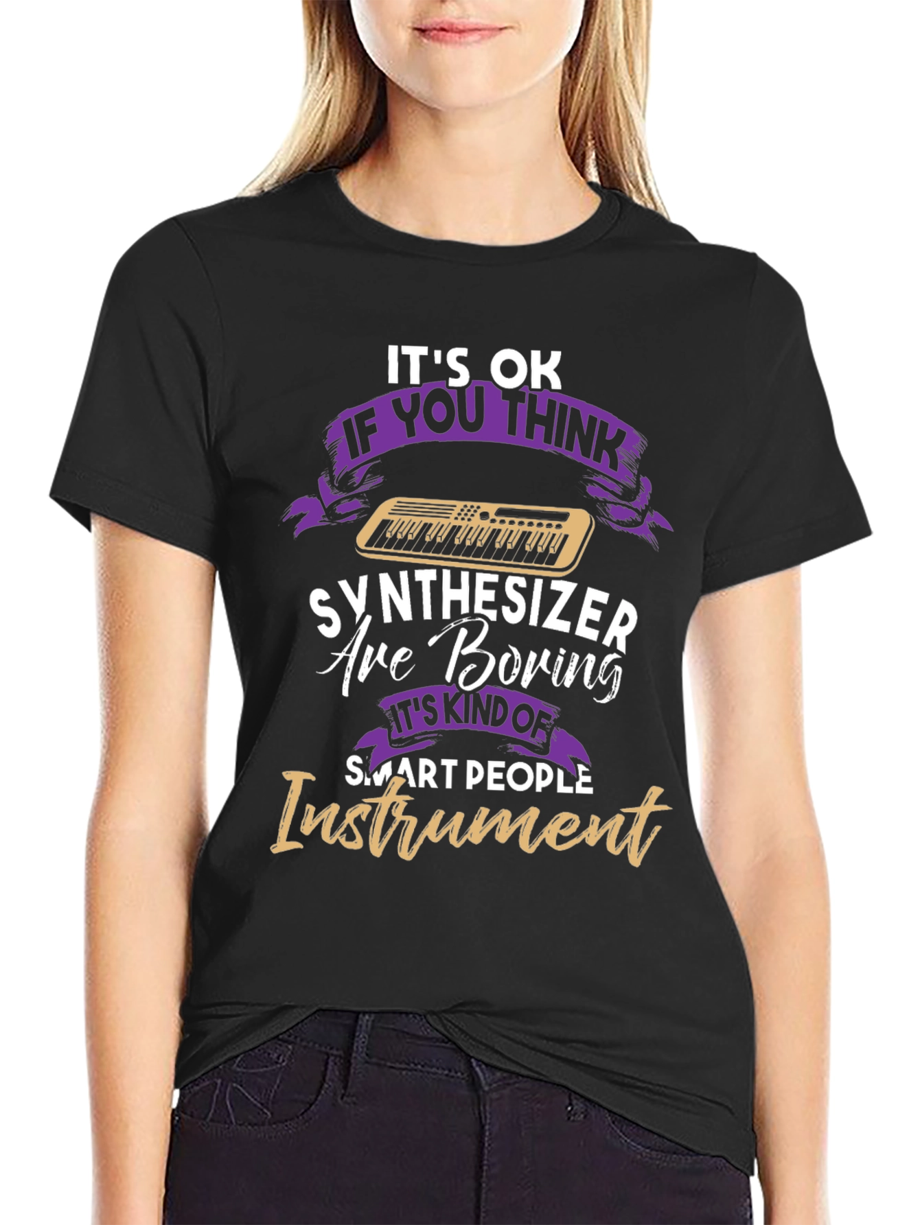 Show off your love for music with this unique black t-shirt. Featuring a graphic design, it showcases the phrase "It's ok if you think synthesizer are boring... It's kind of smart people instrument" adorned with a stylized synthesizer graphic. The design is set against a classic black backdrop, making it versatile for any casual outfit. Made from comfortable materials, this tee is ideal for musicians, music enthusiasts, or anyone with a playful sense of humor. It's perfect for everyday wear, concerts, or band practice. Makes a great gift!