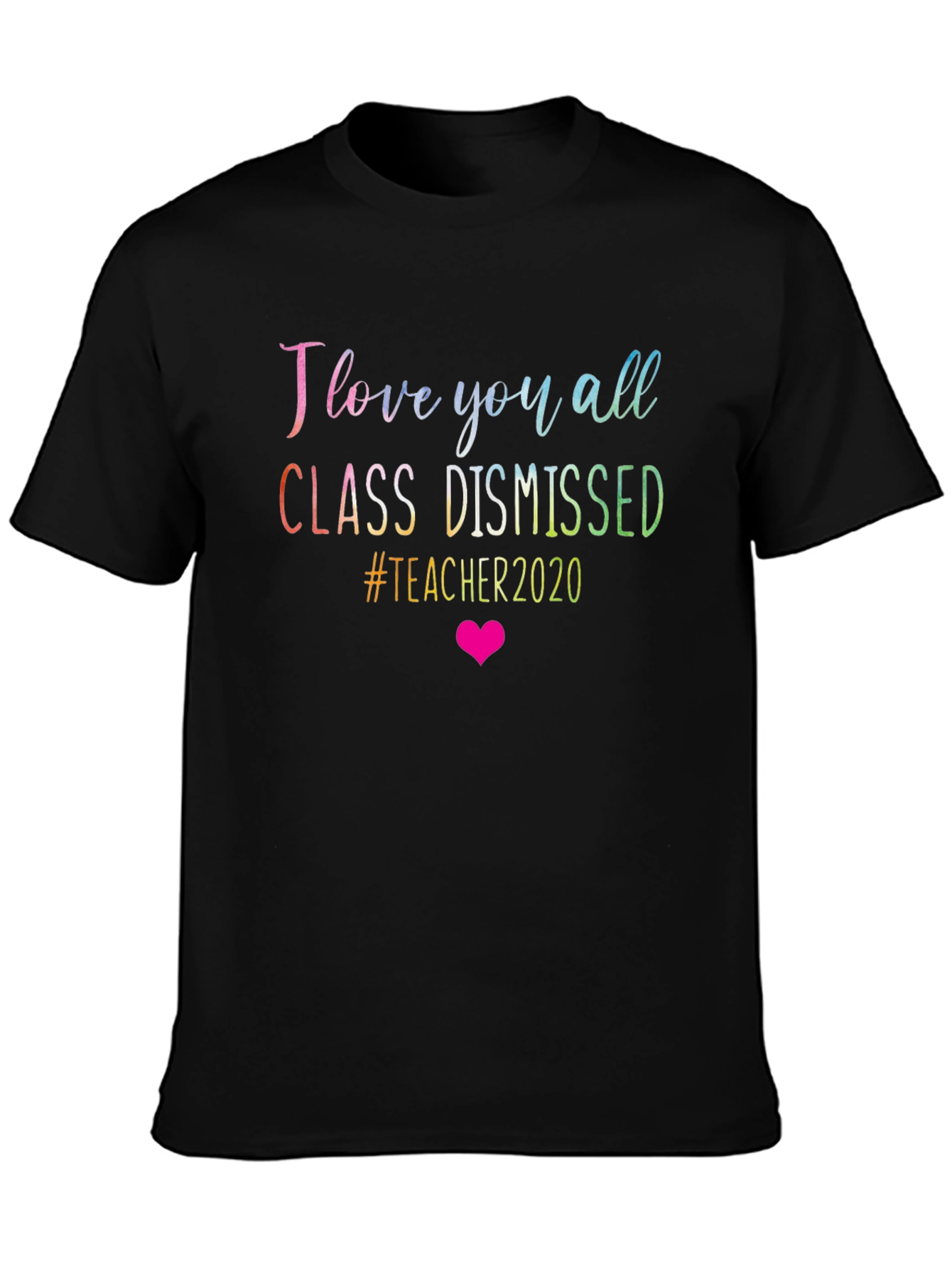 Celebrate the end of the school year with this colorful "I love you all CLASS DISMISSED #TEACHER2020" t-shirt. This tee features a vibrant, rainbow-colored design and is perfect for teachers as a casual wear. It's made from a soft, breathable fabric that is ideal for comfortable all-day wear. The classic fit makes it a versatile addition to any wardrobe. Show your love and appreciation for teachers with this fun and memorable t-shirt.