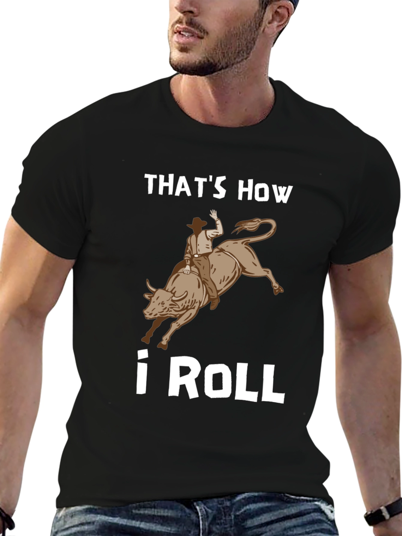 Show off your love for rodeo with this stylish black t-shirt. Featuring a bold graphic of a cowboy riding a bull, paired with the humorous phrase "That's How I Roll", this tee is sure to turn heads. Made from comfortable fabric, it's perfect for everyday wear or a trip to the rodeo. The detailed design and catchy slogan make it a great conversation starter. Get ready to embrace your inner cowboy with this must-have t-shirt!