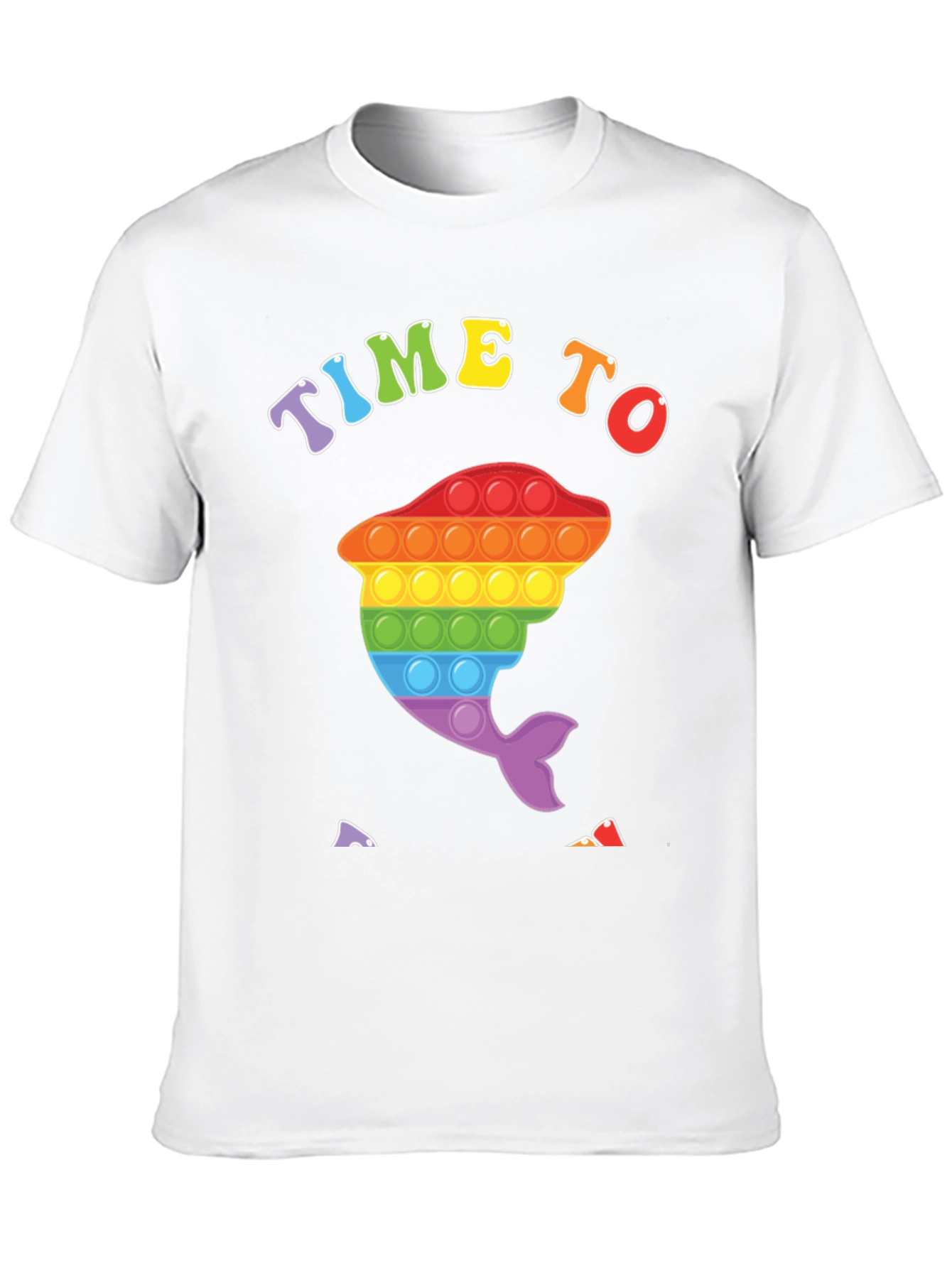 Dive into fun with this unique black t-shirt featuring a vibrant rainbow dolphin design! This eye-catching tee showcases a playful "Time To" message above a dolphin rendered in a 'pop it' bubble style pattern. The colorful design spans the rainbow, making it a cheerful addition to any wardrobe. Perfect for casual wear, this tee is a great conversation starter and a fun way to express your playful side. Wear it to school, the park, or just lounging at home. Get ready to pop into style with this must-have tee!